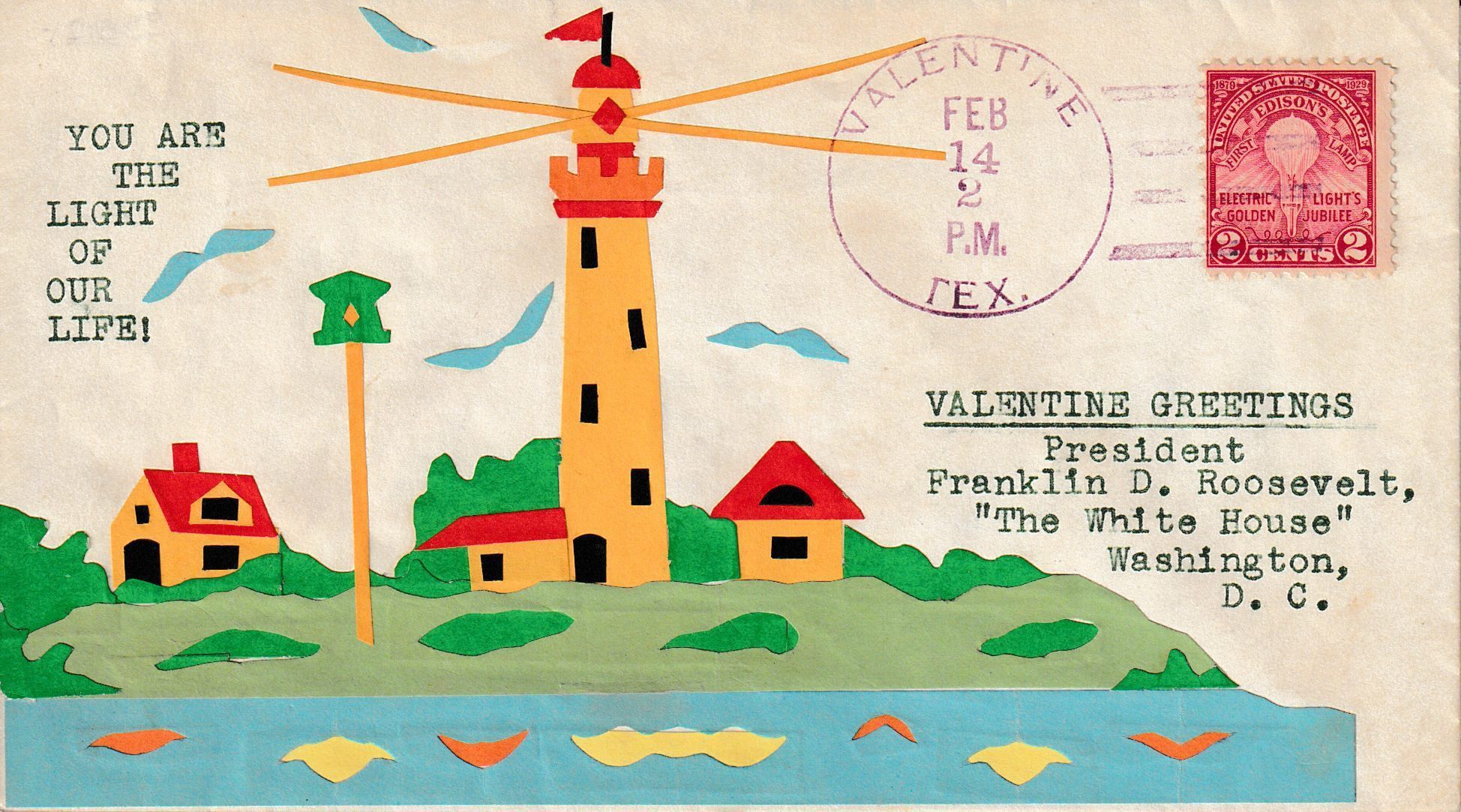 A valentine cover postmarked in Valentine, Texas on February 14, 1934. Addressed "VALENTINE GREETINGS President Franklin D. Roosevelt, "The White House," Washington, D.C." Cachet of a lighthouse and typed, "YOU ARE THE LIGHT OF OUR LIFE." On the back, stamped in black "FROM THE FRANKLIN D. ROOSEVELT COLLECTION / AUTHENTICATED BY H.R. HARMER INC., N.Y."Context