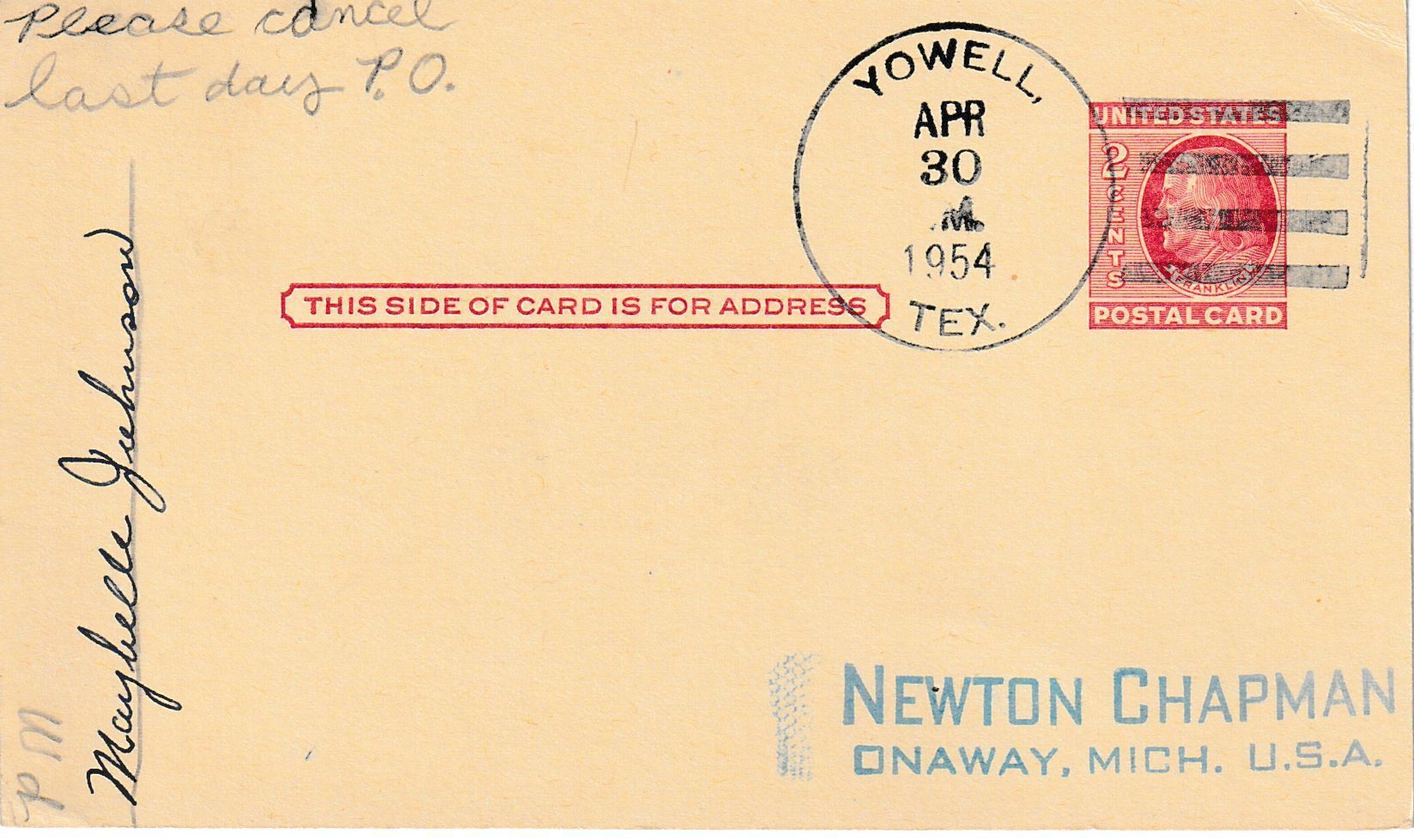 A “Last Day” postal card postmarked on April 30, 1954, on the final day of business of the Yowell Post Office. Signed by the postmaster.Context
