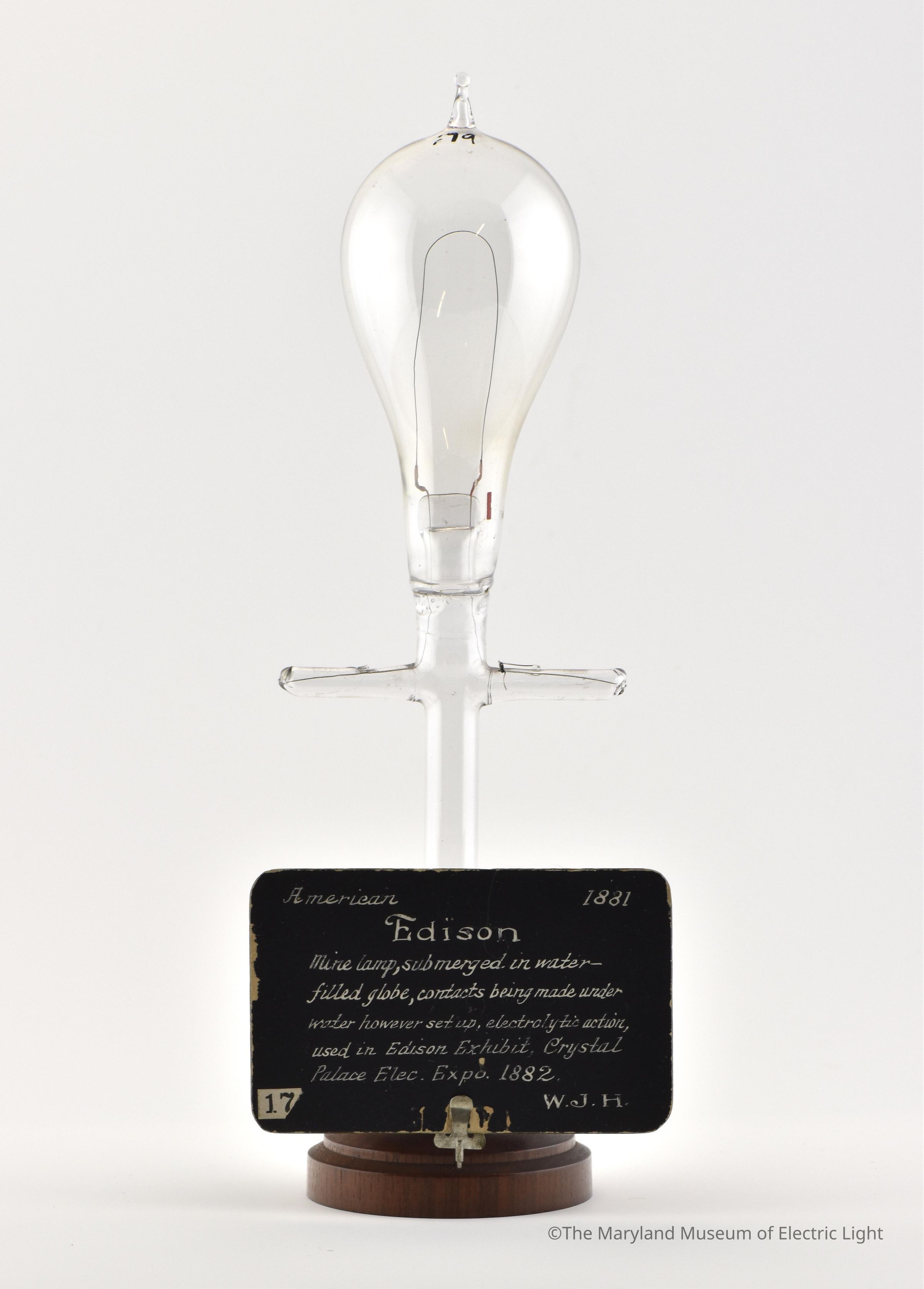 1881 Edison prototype "miner's lamp" used in Edison exhibit at the Crystal Palace in 1882. This lamp is from the William J Hammer Collection.Made/Created