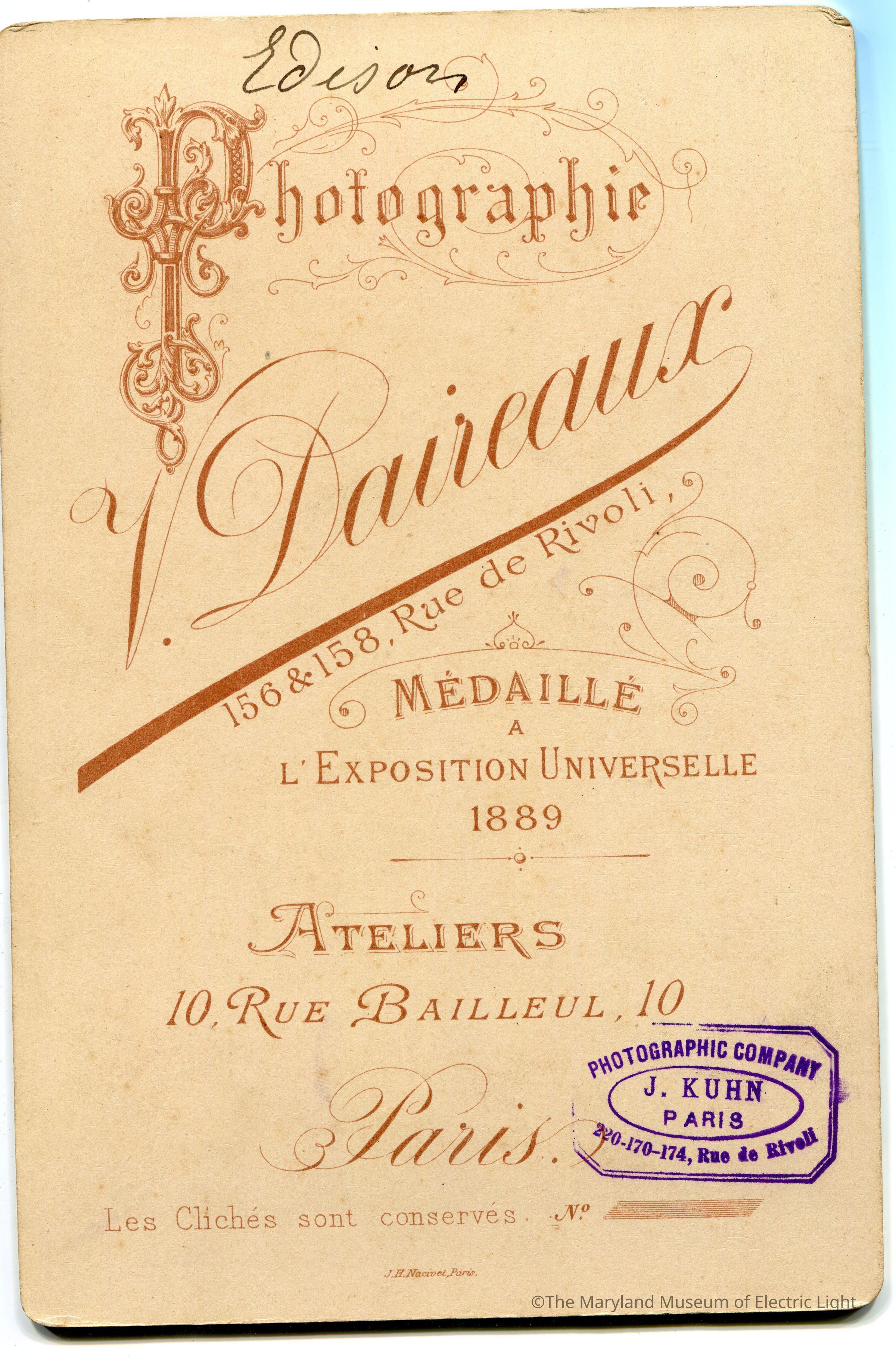 1889 Paris Exhibition Thomas Edison Cabinet Card #1Entry/Object ID