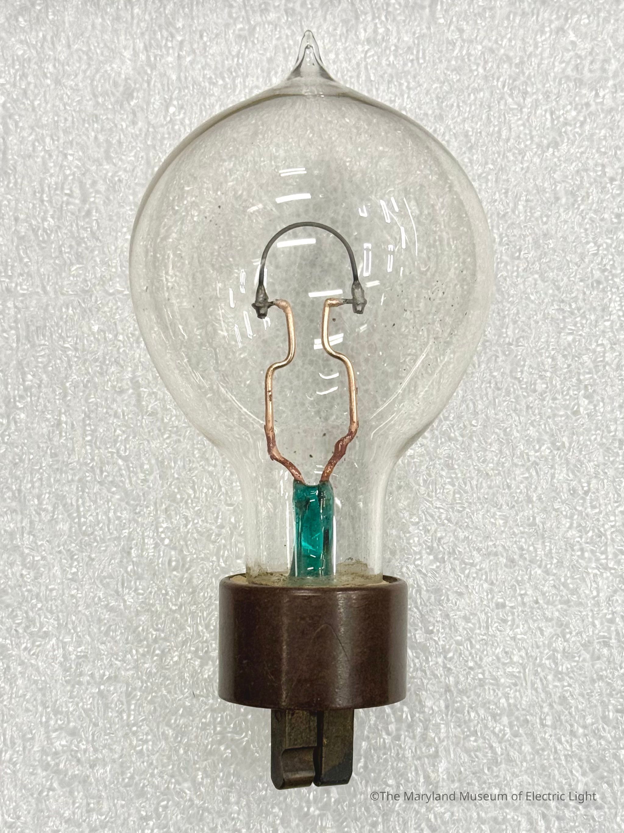 Incandescent lamp made by Bernstein Electric Manufacturing Co. with a braided silk, round-profile carbonized filament. Base made of gutter-percha/hard rubber like material with square pin attachment contacts.Made/Created