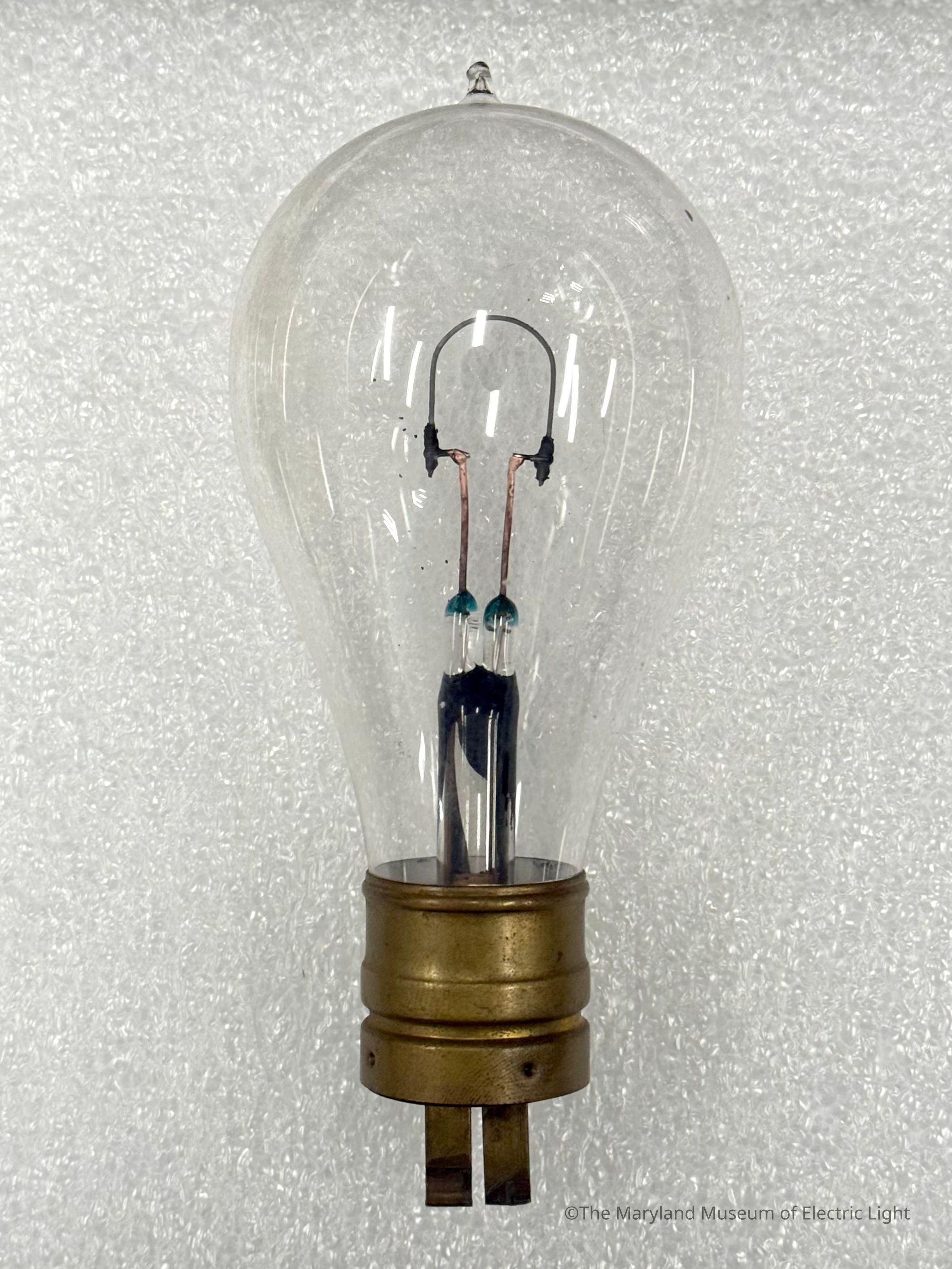Incandescent lamp made by Bernstein Electric Manufacturing Co. with a braided silk, round-profile carbonized filament. Base contacts are insualted with a gutta percha/hard rubber like material with square pin attachment contacts.Made/Created