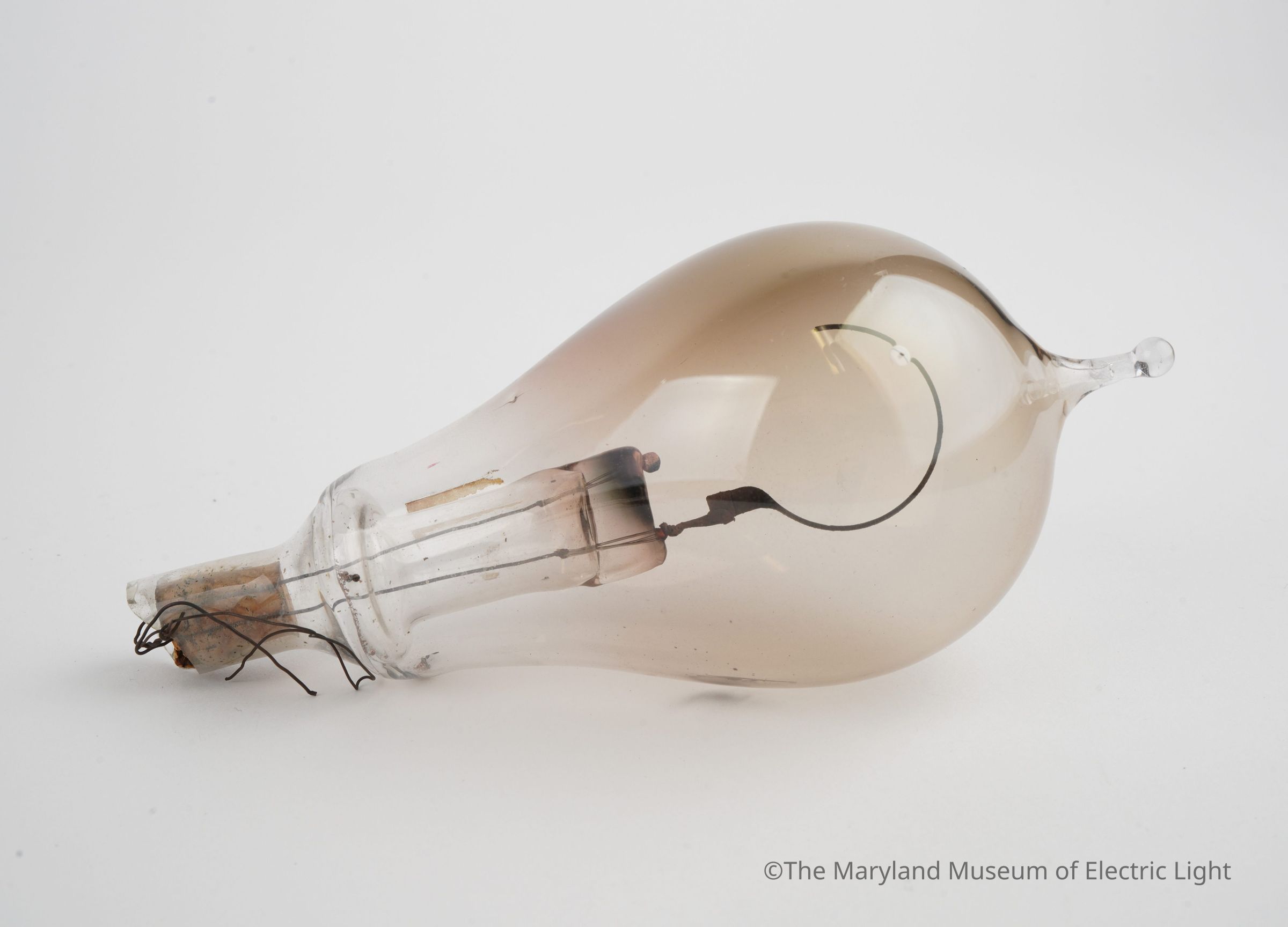 Experimental lamp with filament of compressed plumbago (19th century term for graphite). Filament is die-cut with dies originally used for bristol board filaments from late 1879/early 1880. Filament attached via copper plating method as became standard on Edison lamps by 1881. Filament failure likely cased by resistance built up at one attachment "clamp" point having poor conductivity causing the copper to melt as well as vaporize.Made/Created