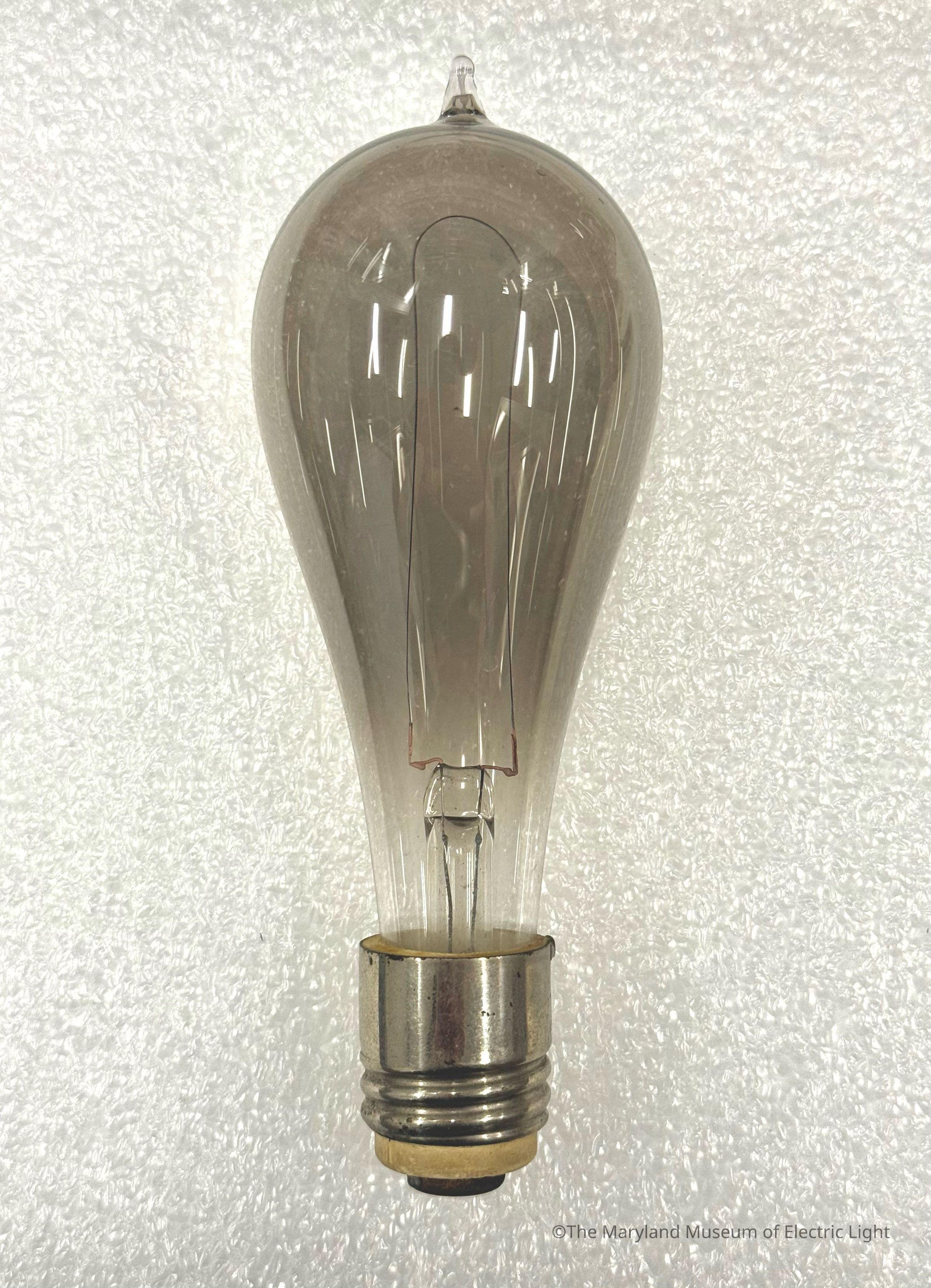 Edison incandescent lamp from the collection of Martin F. Force. Forced work as an Edison assistant beginning at Menlo Park in 1877. Surviving lab notes show Force’s involvement in incandescent lamp development into the latter part of the 1880’s. This examples has a base with an otherwise unseen of the era extended base with a thread length that is typical of the Edison lamps until the middle of the 1880’s. The base is nickel plated, a proactive typically only seen on larger lamps with a “skirted” base. Plaster in bottom of base unmarked with voltage, which is atypical. Lamp envelope darkening atypical shade of grey suggesting that this was possibly a filament coating test.Made/Created