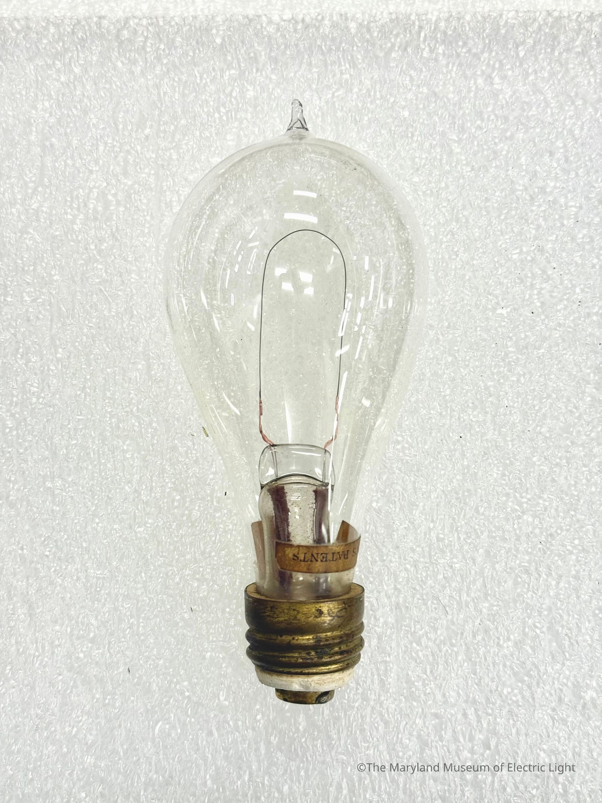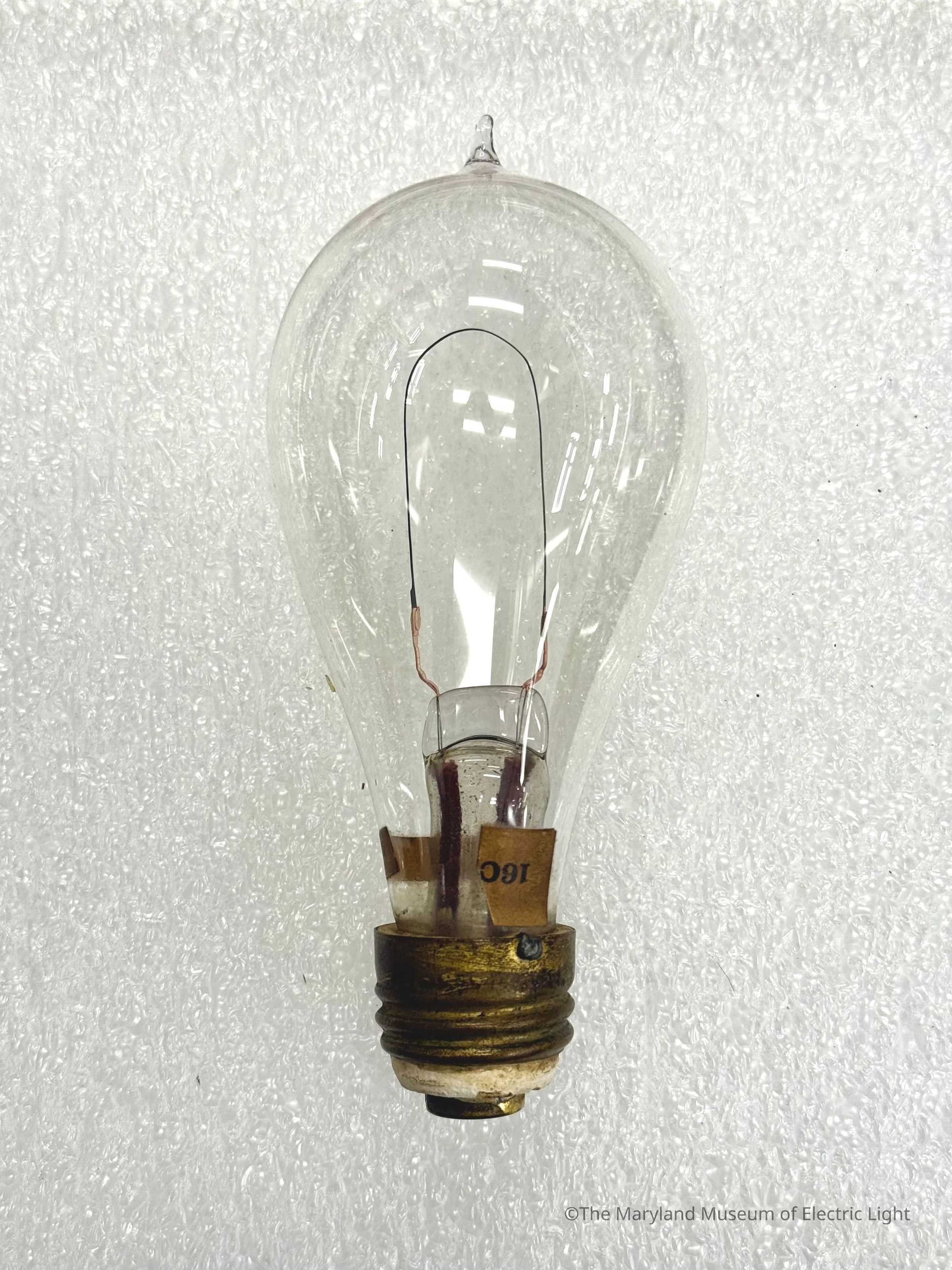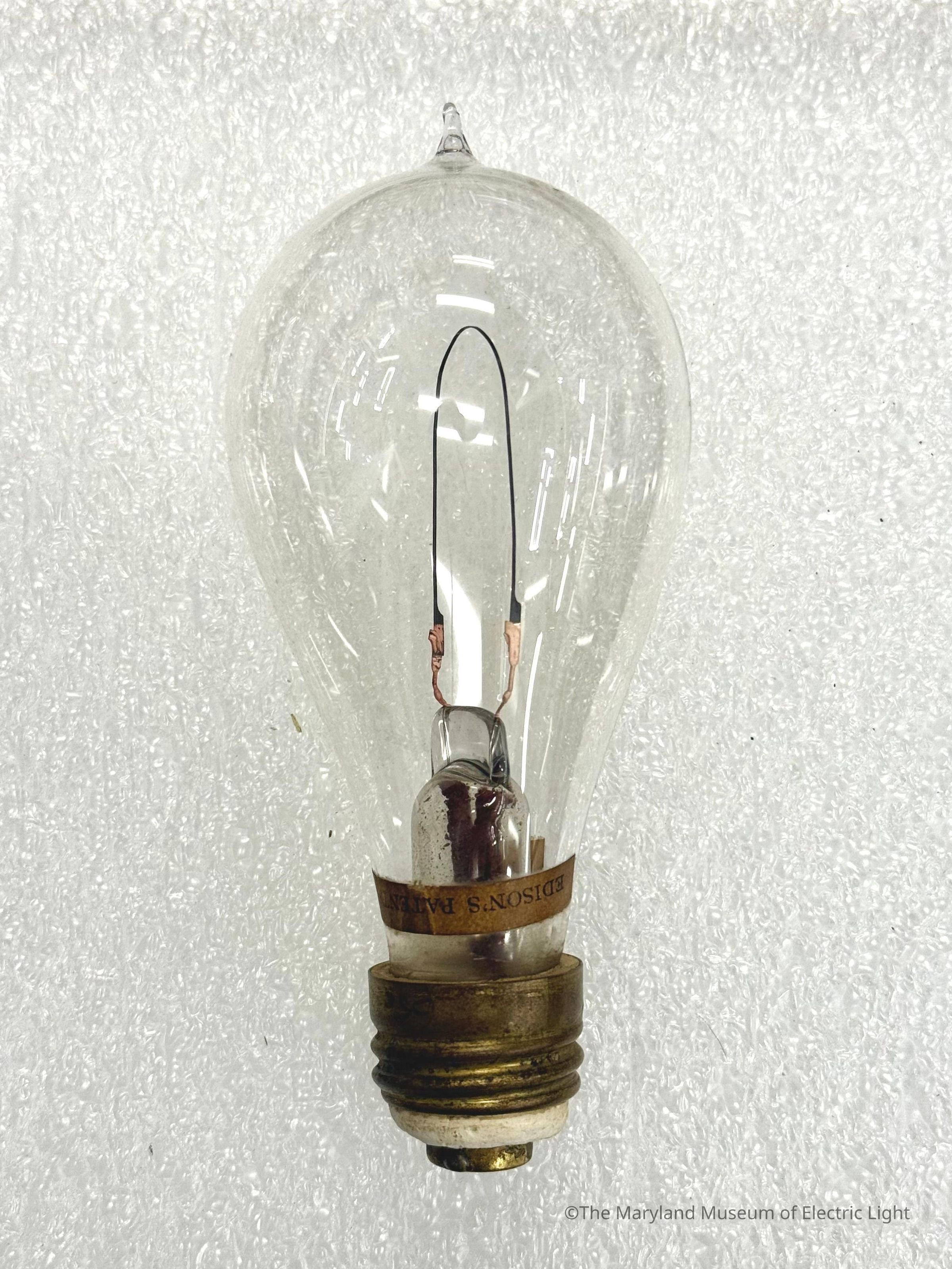 Edison incandescent lamp of the period of about 1884-1885. Carbonized bamboo filament attached with the copper plating method, as developed by Edison in 1881. 16 candlepower lamp with secondary candlepower rating label. Lead wires in stem insulated with maroon colored woven insualtion. This inuslation was intended to extend past the glass envelope, and prevent one lead wire from shorting with the cewnter contact while en route to the top of the threaded shell.Made/Created