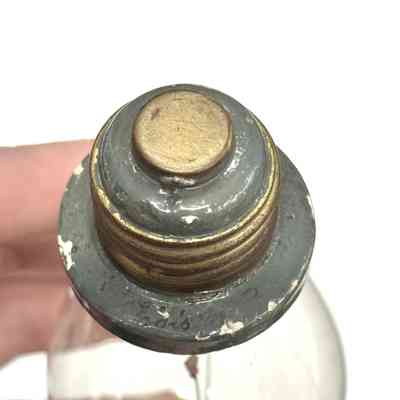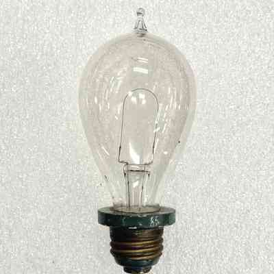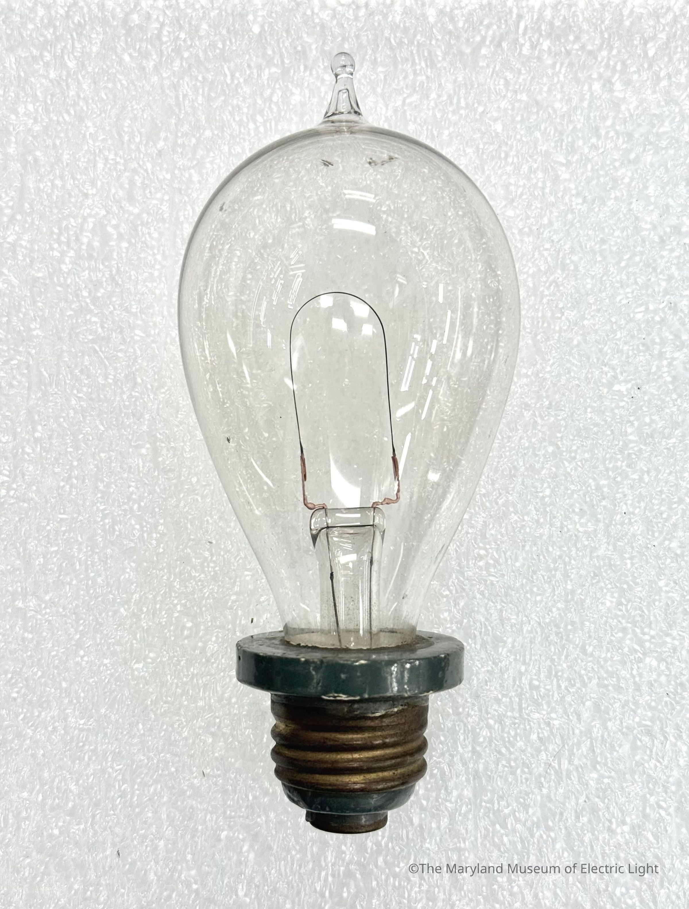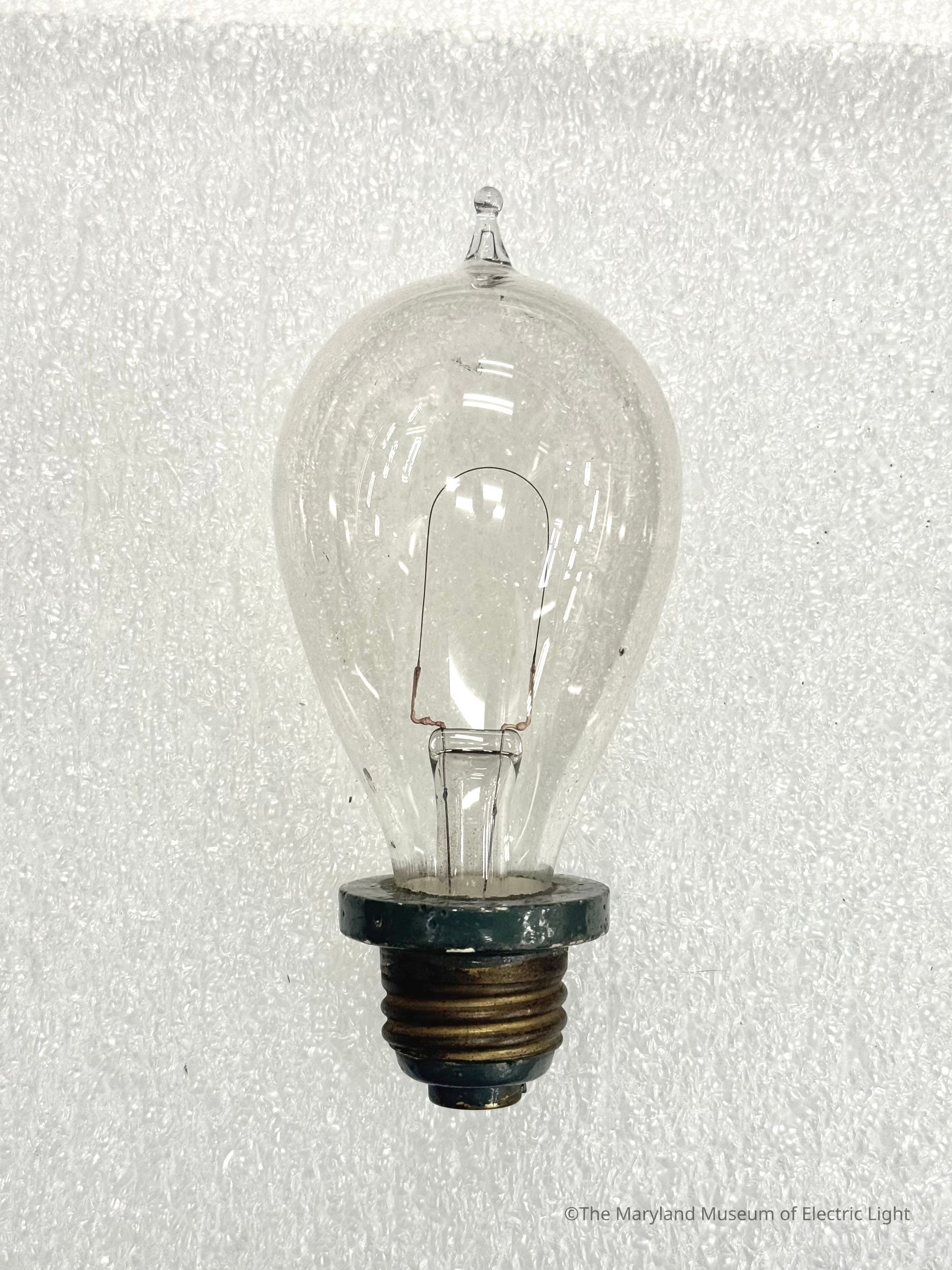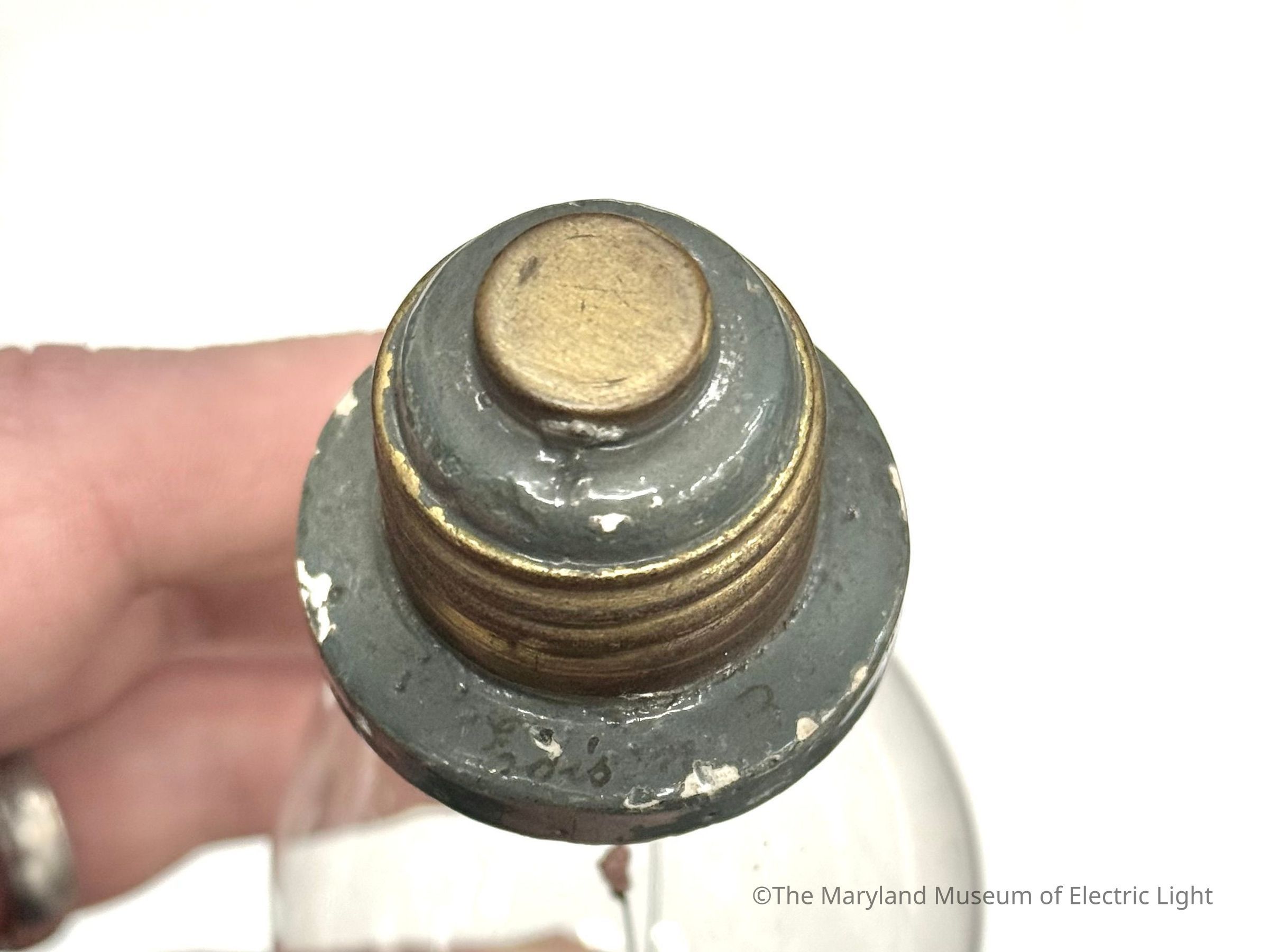 Edison Incandescent Lamp, third form Edison screw base, c. November 1881–1883. The plaster collar, a remnant of an earlier base design, served primarily as a gripping surface during installation. 8-candlepower lamp. Found in Bonn, Germany. The grey-blue painted collar and base insulation, characteristic of European-market Edison lamps, was applied to seal the plaster against moisture absorption and electrical conductivity. Likely produced at the Edison lamp factory Société Industrielle et Commerciale Edison in Paris.Made/Created