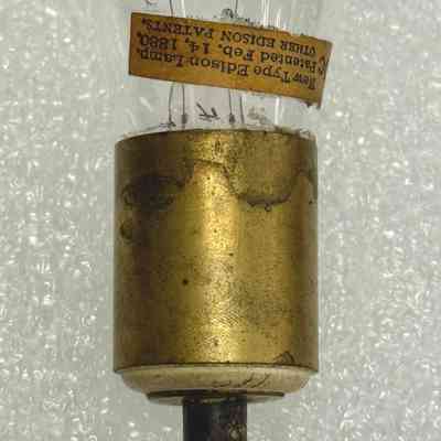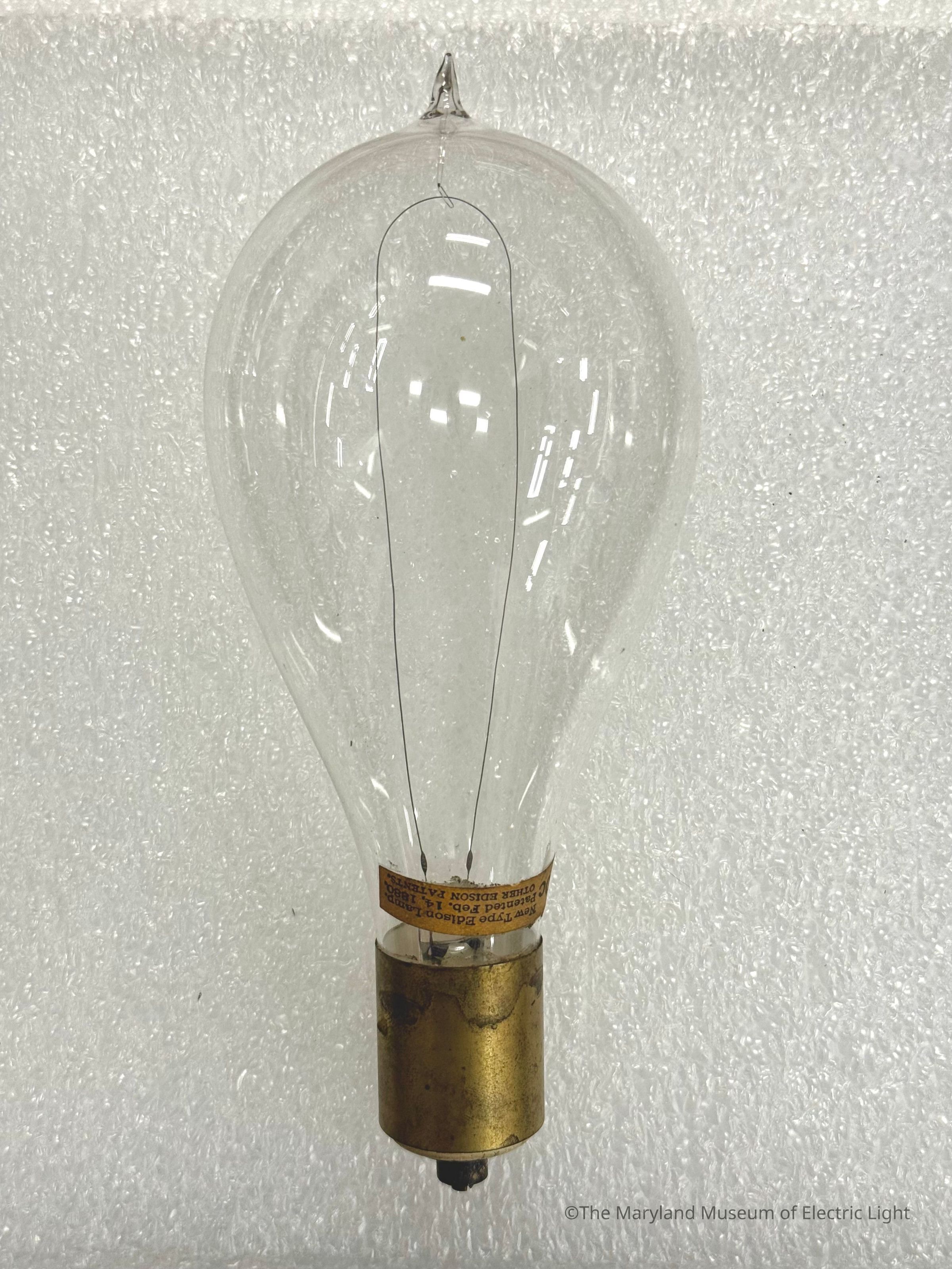 “New Type” Edison Incandescent Lamp, General Electric Co., c. 1892–1893. With few exceptions, Edison lamps produced prior to the formation of General Electric were fitted with Edison screw bases. This example, from the General Electric era, is fitted with a base for the United States Electric Lighting Co./Weston system. 20-candlepower lamp. A platinum support loop at the crown of the envelope indicates manufacture for use in vibration-prone environments.