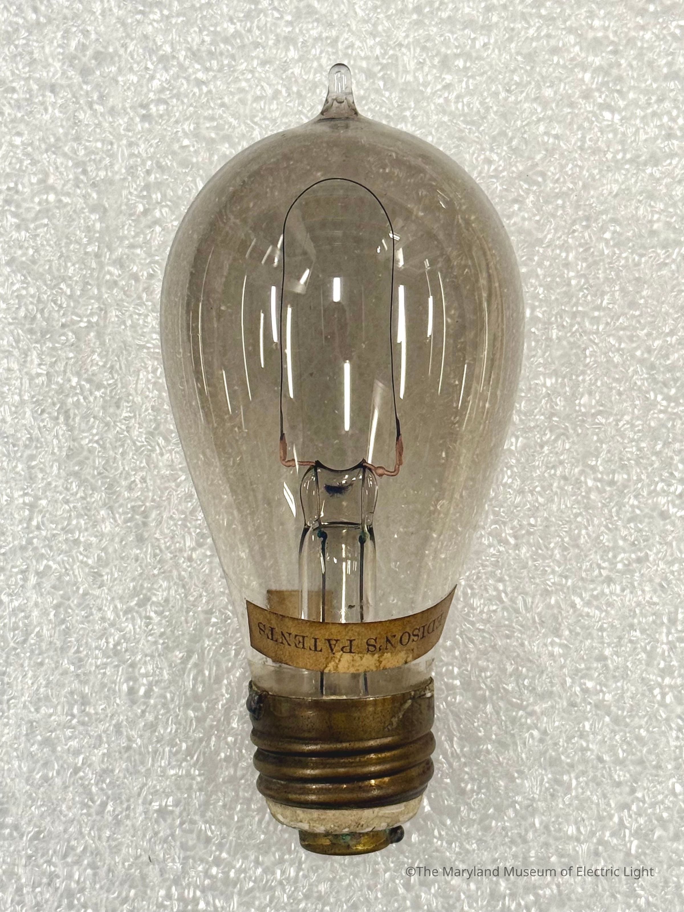 Edison incandescent lamp of the period of about 1883-1884. Carbonized bamboo filament attached with the copper plating method, as developed by Edison in 1881. 8 candlepower lamp, with a separate "8C" label opposite the "Edison's Patents" label.Made/Created