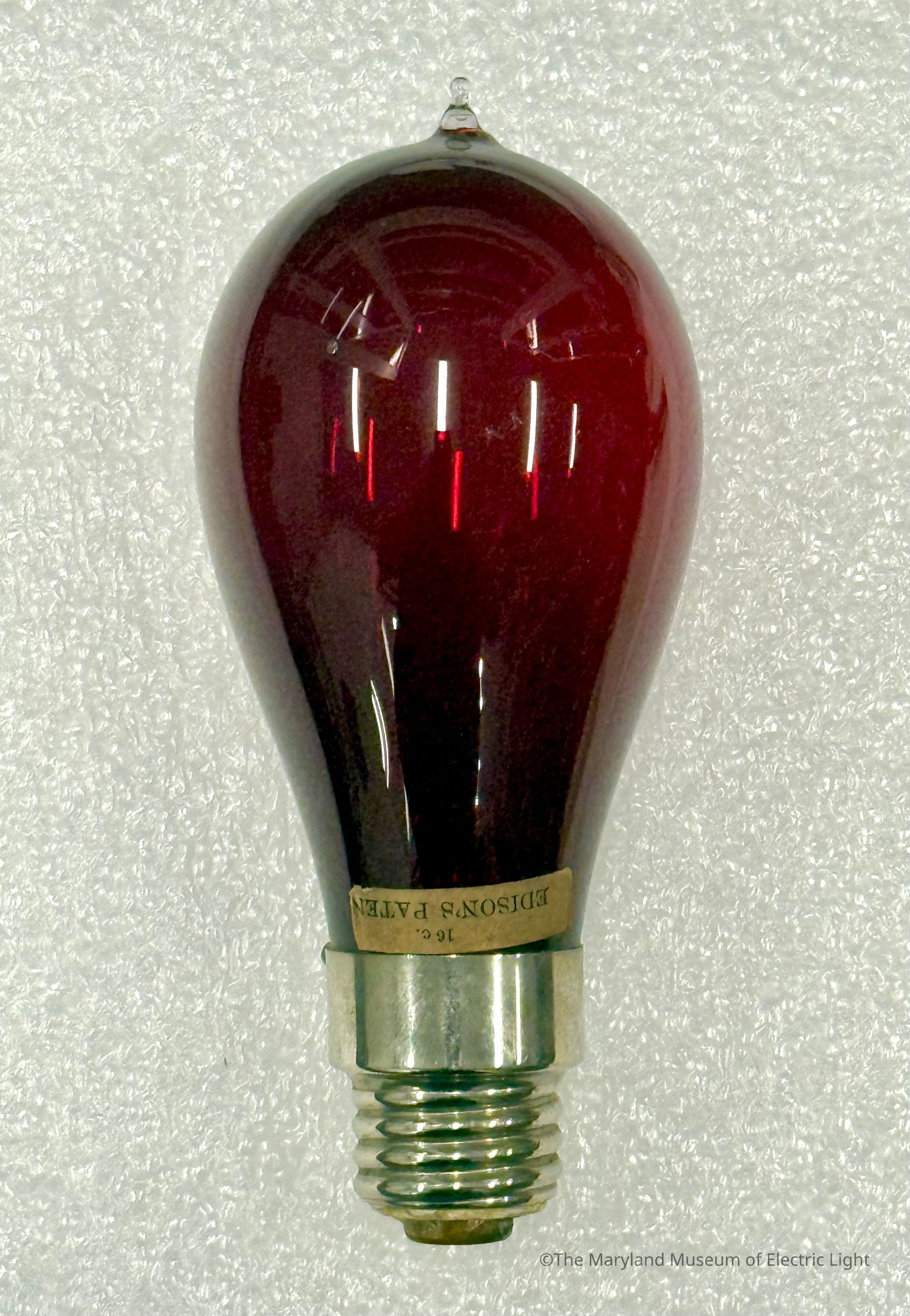 Edison incandescent lamp of red colored glass. Base of nickel plated brass, a finish typucaly used on large examples than this one. Platinum "goal post" internal lead wires.Made/Created