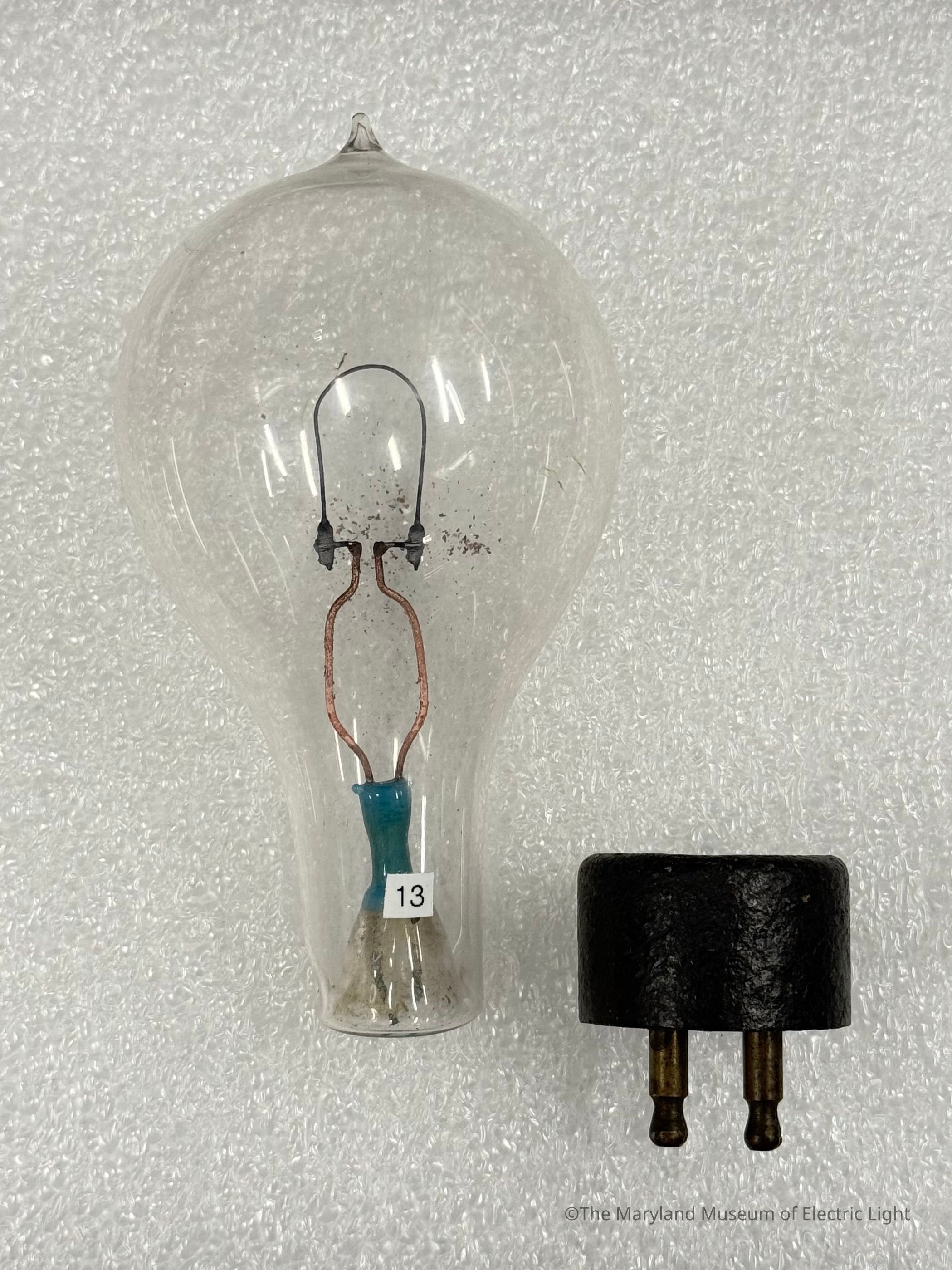 Incandescent lamp by the Heisler Electric Light Co., designed for use on a series burning arc lighting circuit. The hard rubber insulated/bodied base is present but separated from the lamp.Made/Created