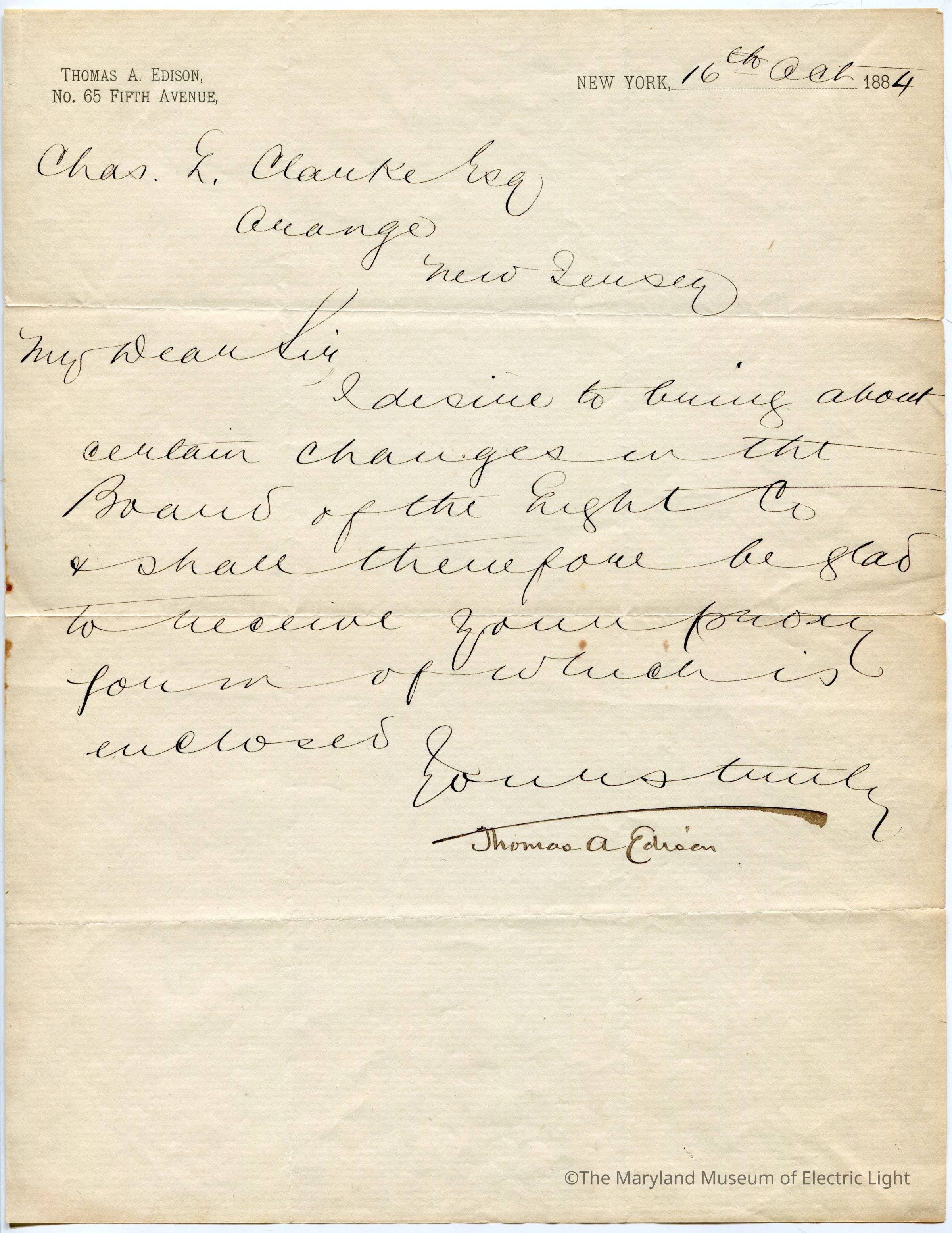 Letter: Thomas A Edison to Charles L Clarke
