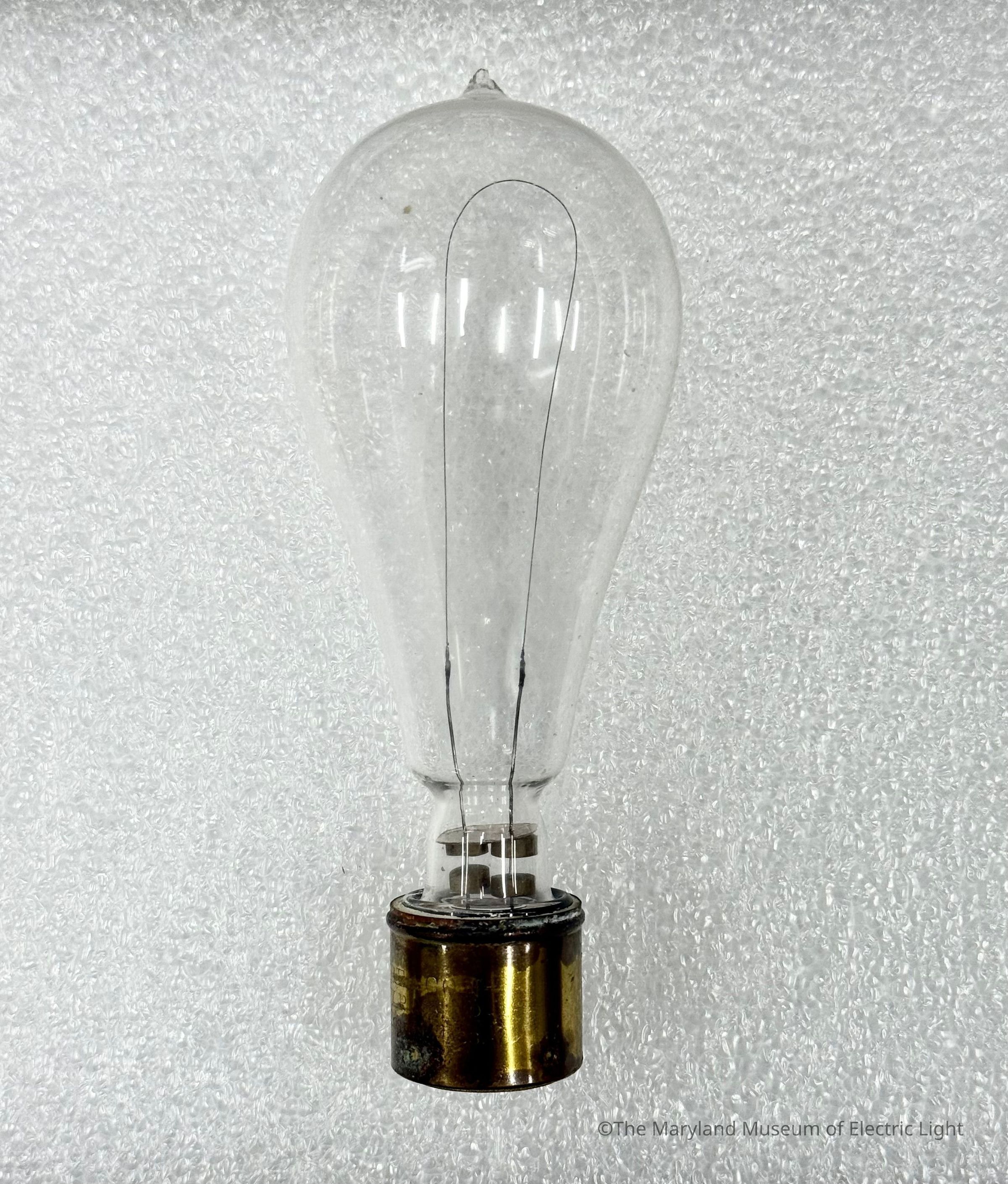 "New Beacon" lamp designed to avoid infringement of the Edison lamp patents. The lamp does not make use of a fully fused glass envelope, nor platinum wire entering into the glass envelope - 2 key points of the Edison lamp patents. The New Beacon lamp makes use of a compound-filled base to hold the lamp's vacuum, with copper heat sinks and a mica disc to help dissipate heat from the filler compound. This example is fitted with a Thomson Houston base.Made/Created