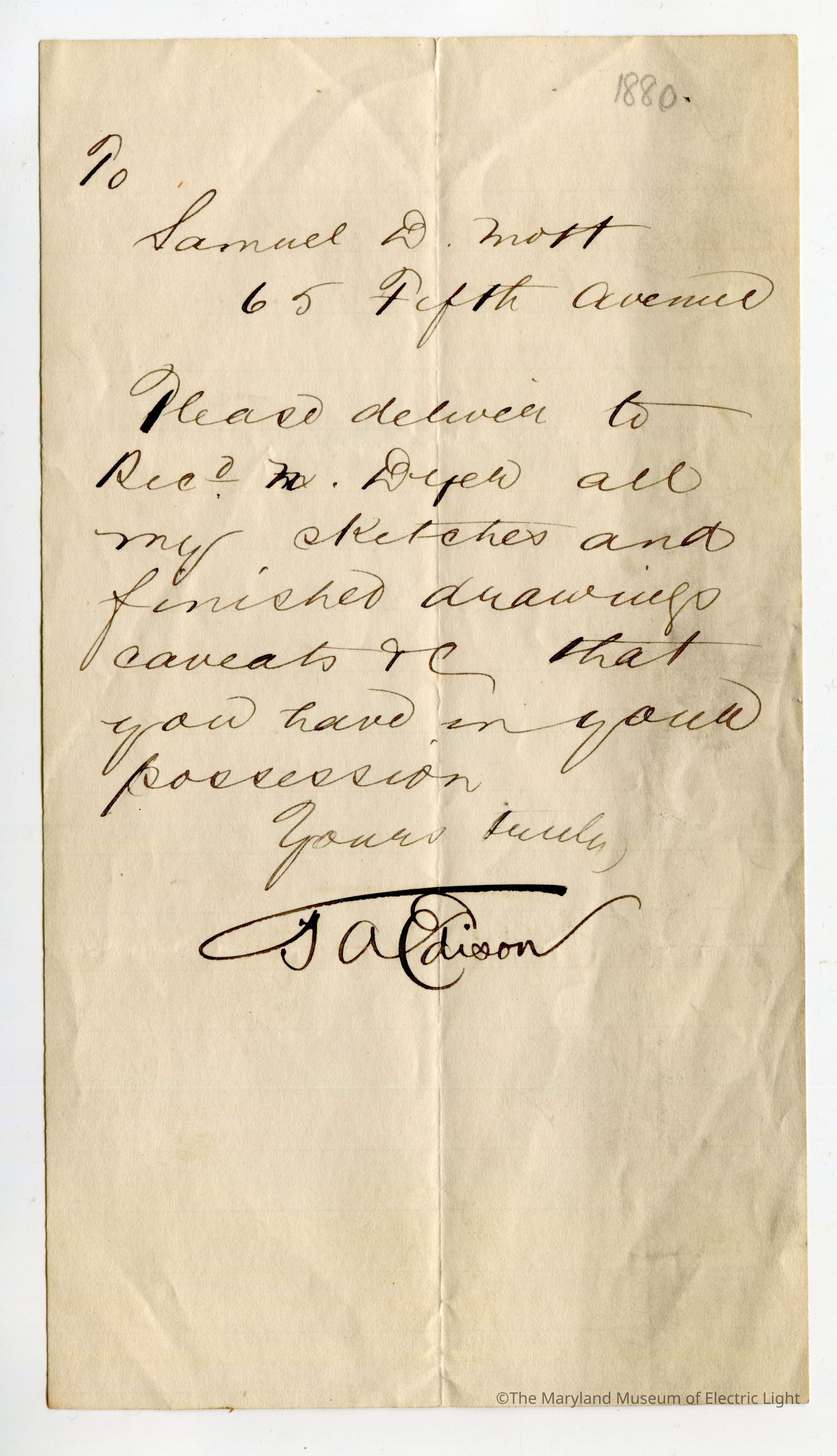 Letter from T.A. Edison to S.D Mott regarding patent related drawings to be presented to Richard Dyer, patent attorney. Message in Samuel Insull’s (secretary) hand, signature in Thomas A. Edison’s hand. “1880” marking in pencil at top right added by an unknown and incorrect. Edison moved his business operation to 65 5th Ave, NY, NY in March of 1881.