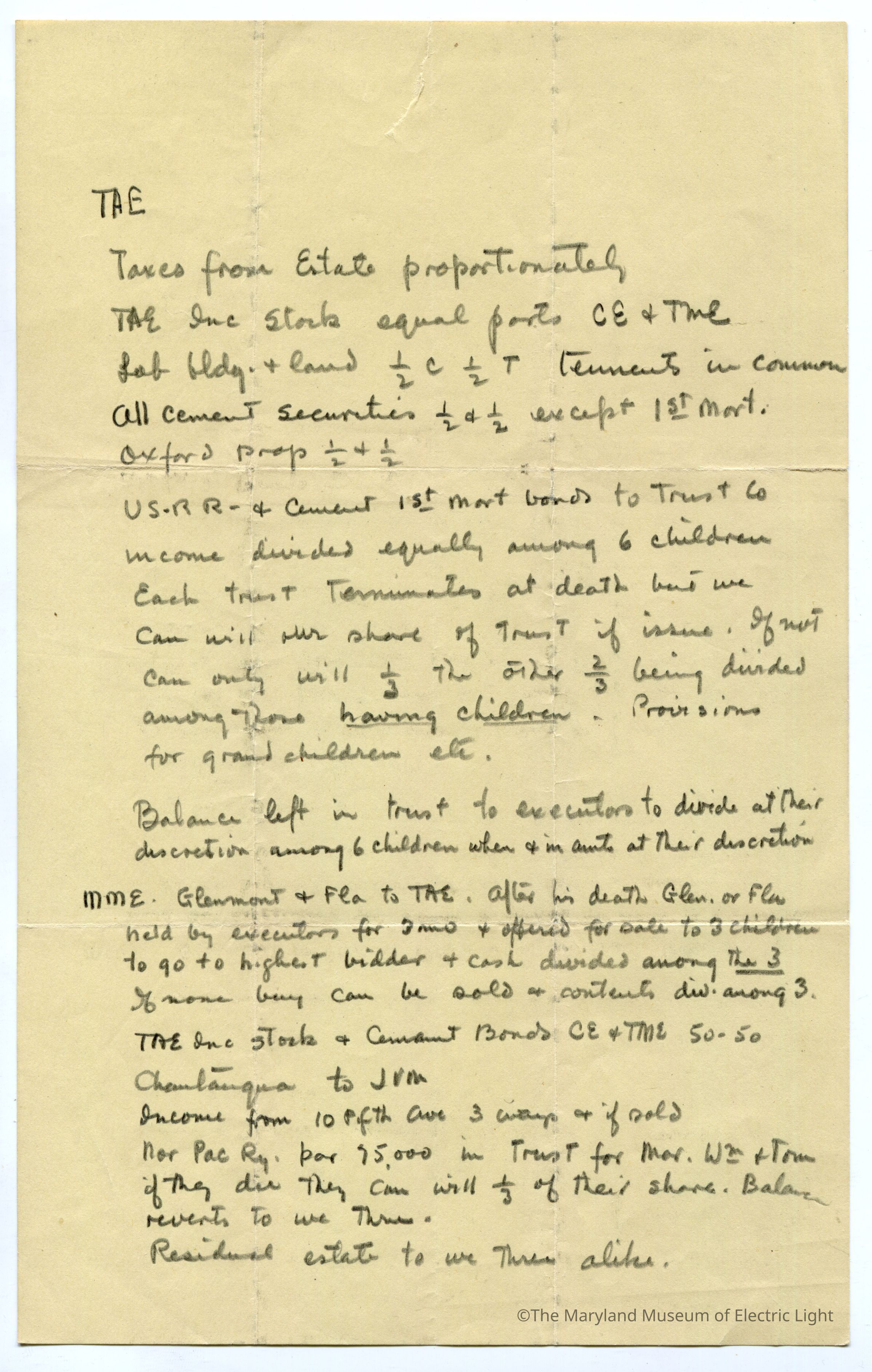 Outline of will for Thomas A. Edison and Mina Miller Edison in Charles Edison's Hand