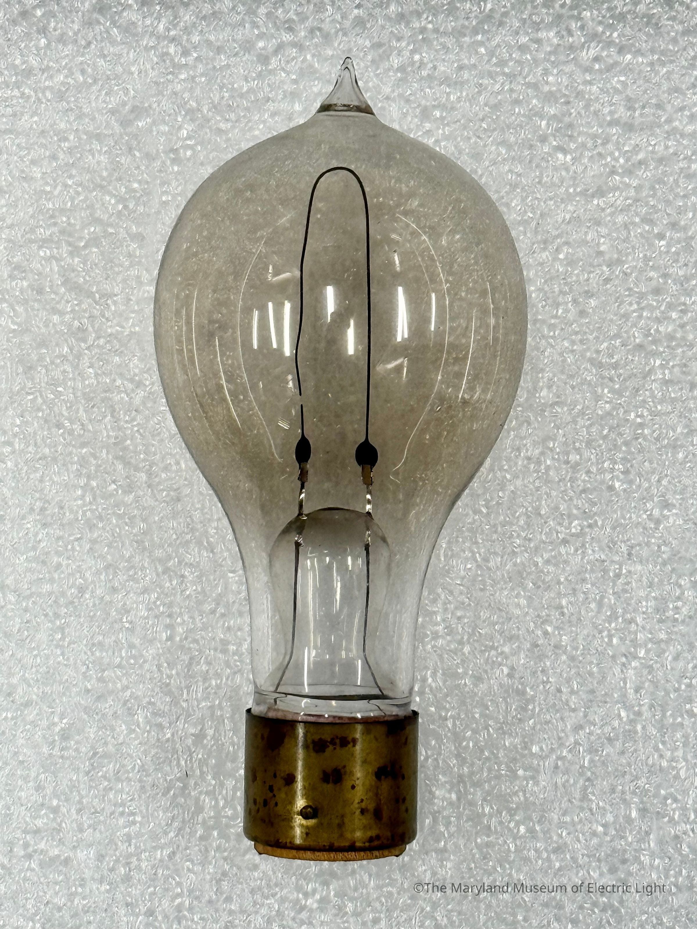 c.1886 Perkins lamp with carbonized paper filament and wood insulated "Mater/Perkins" base. Filament open.Made/Created