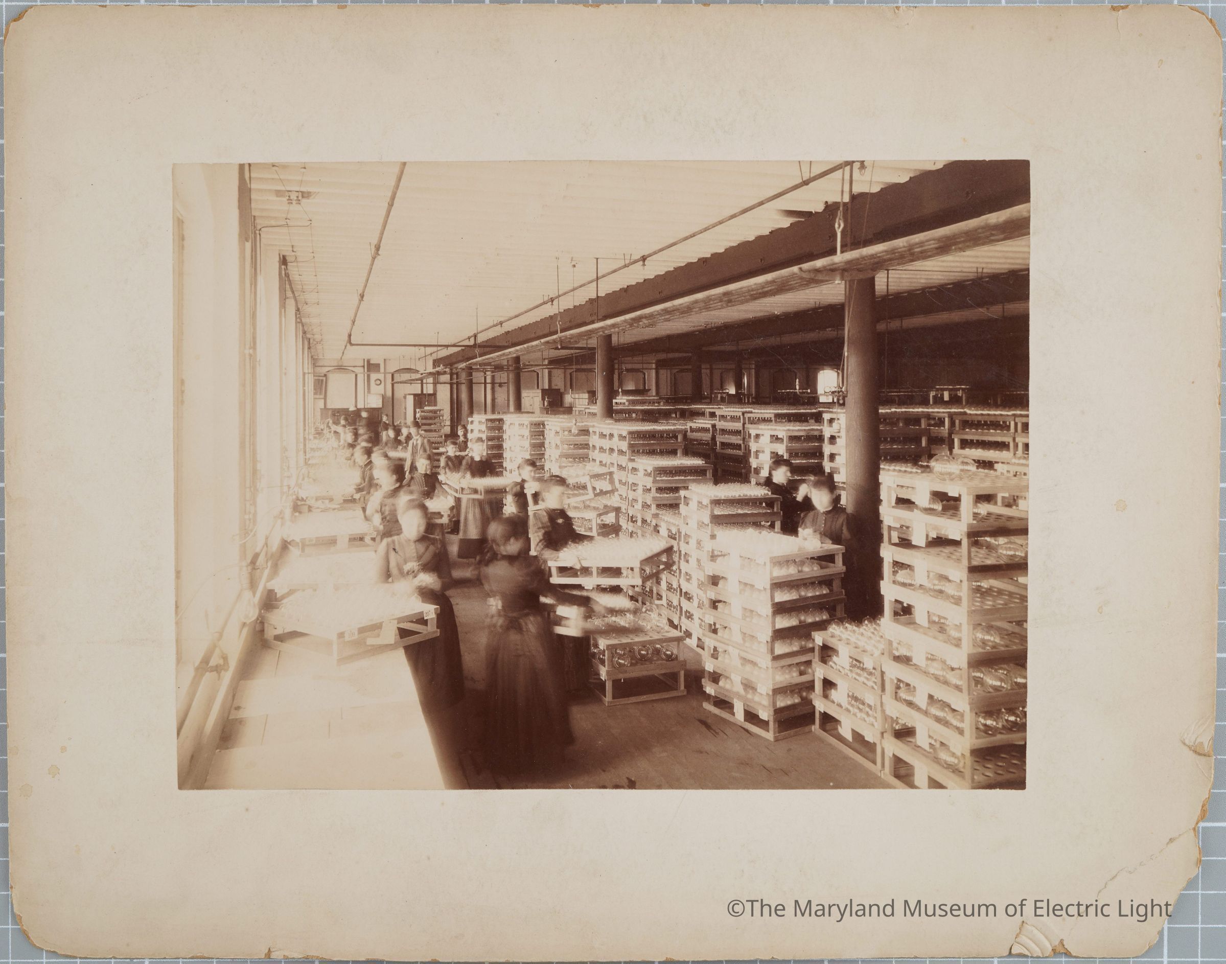 Photograph of interior of the Edison lamp Co factory in Harrison, NJ.