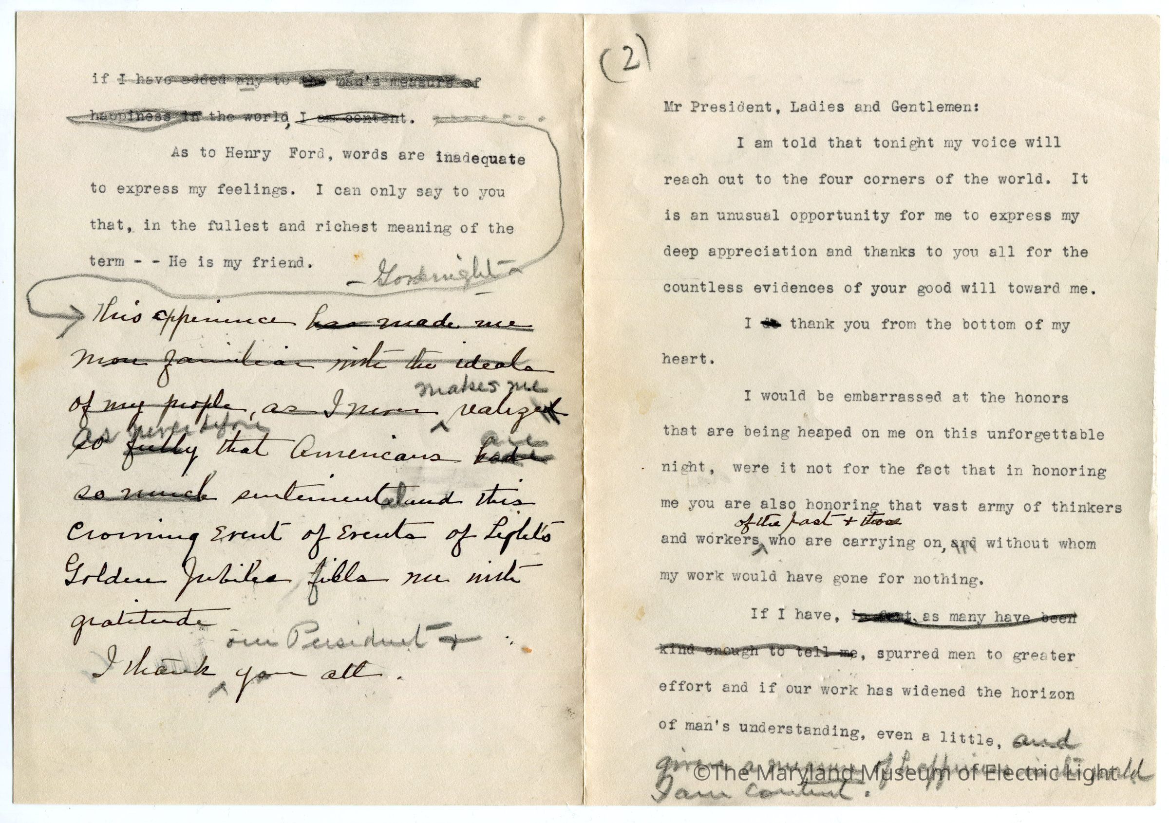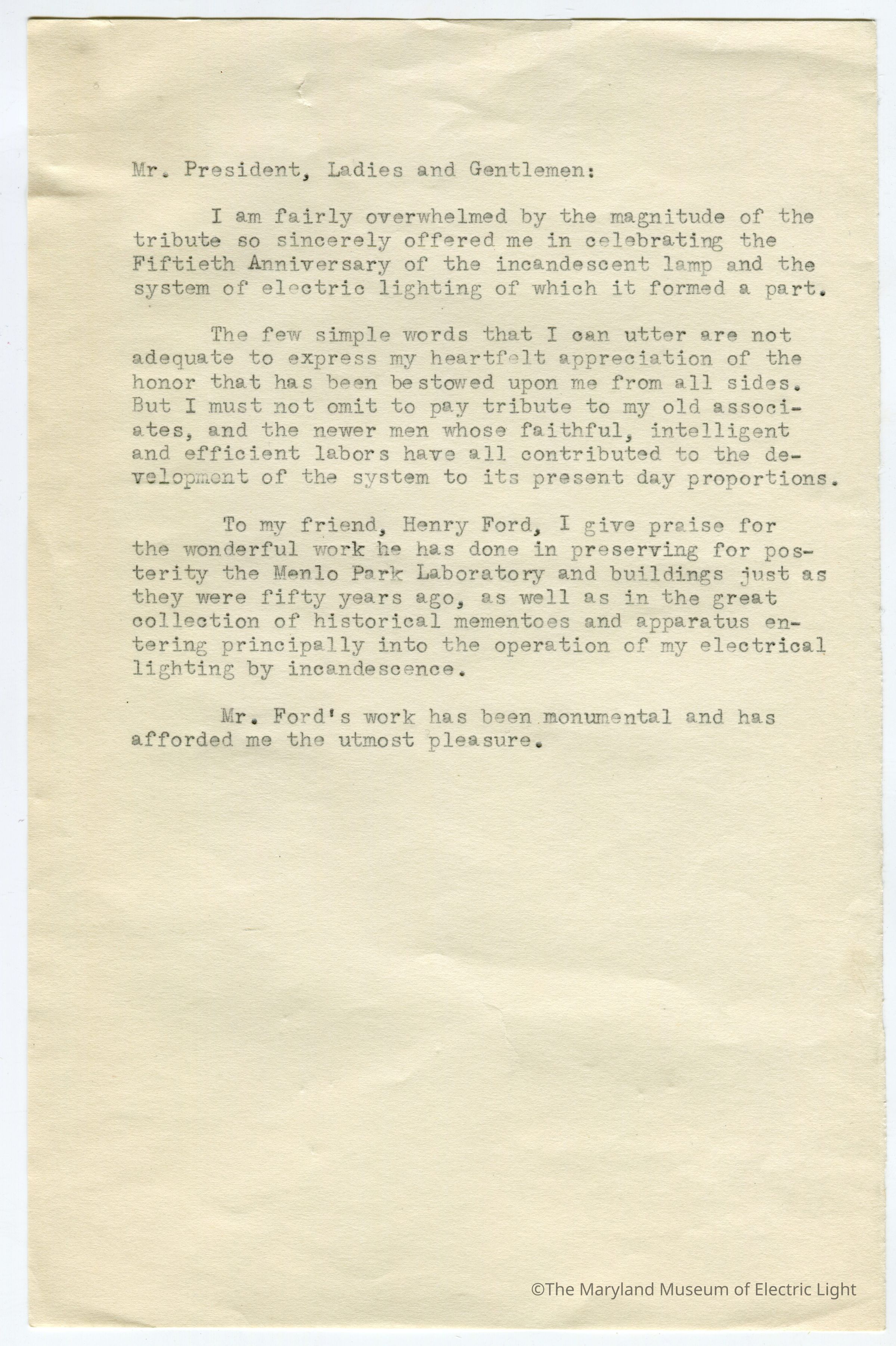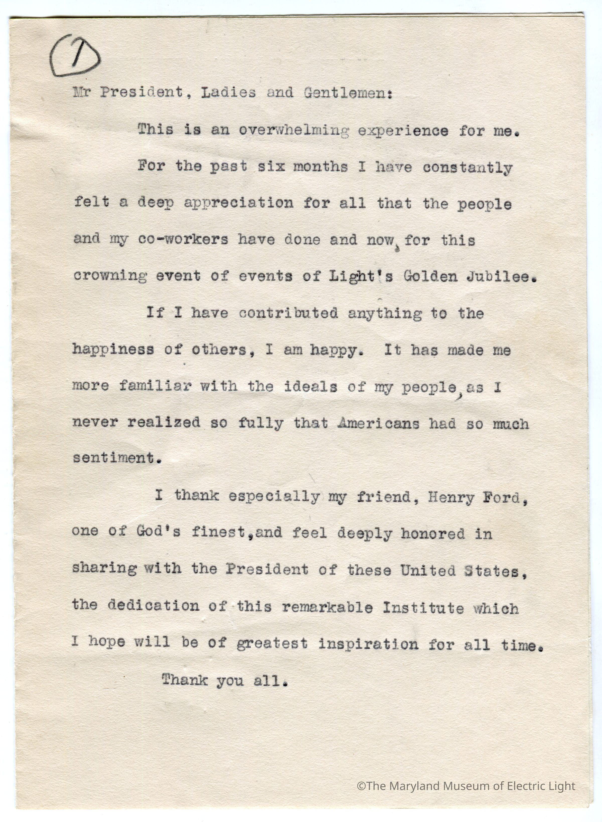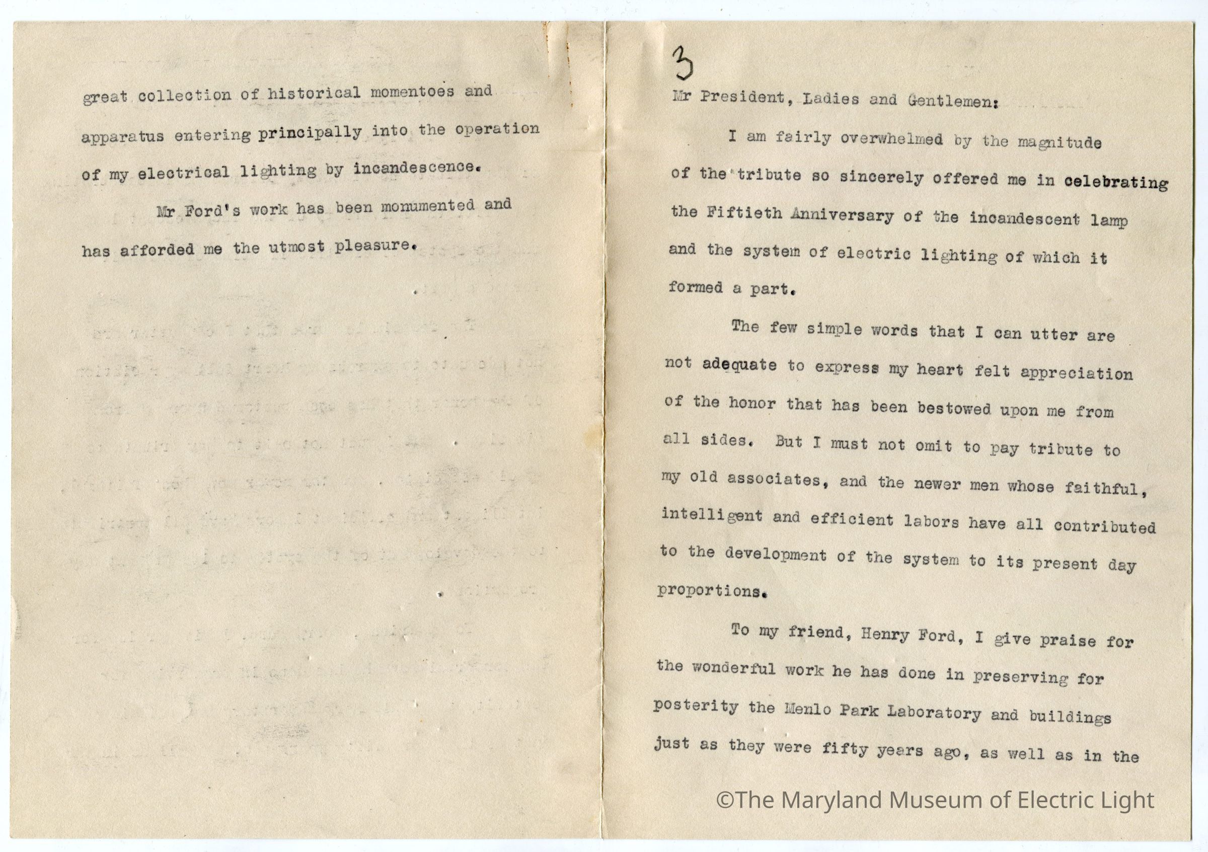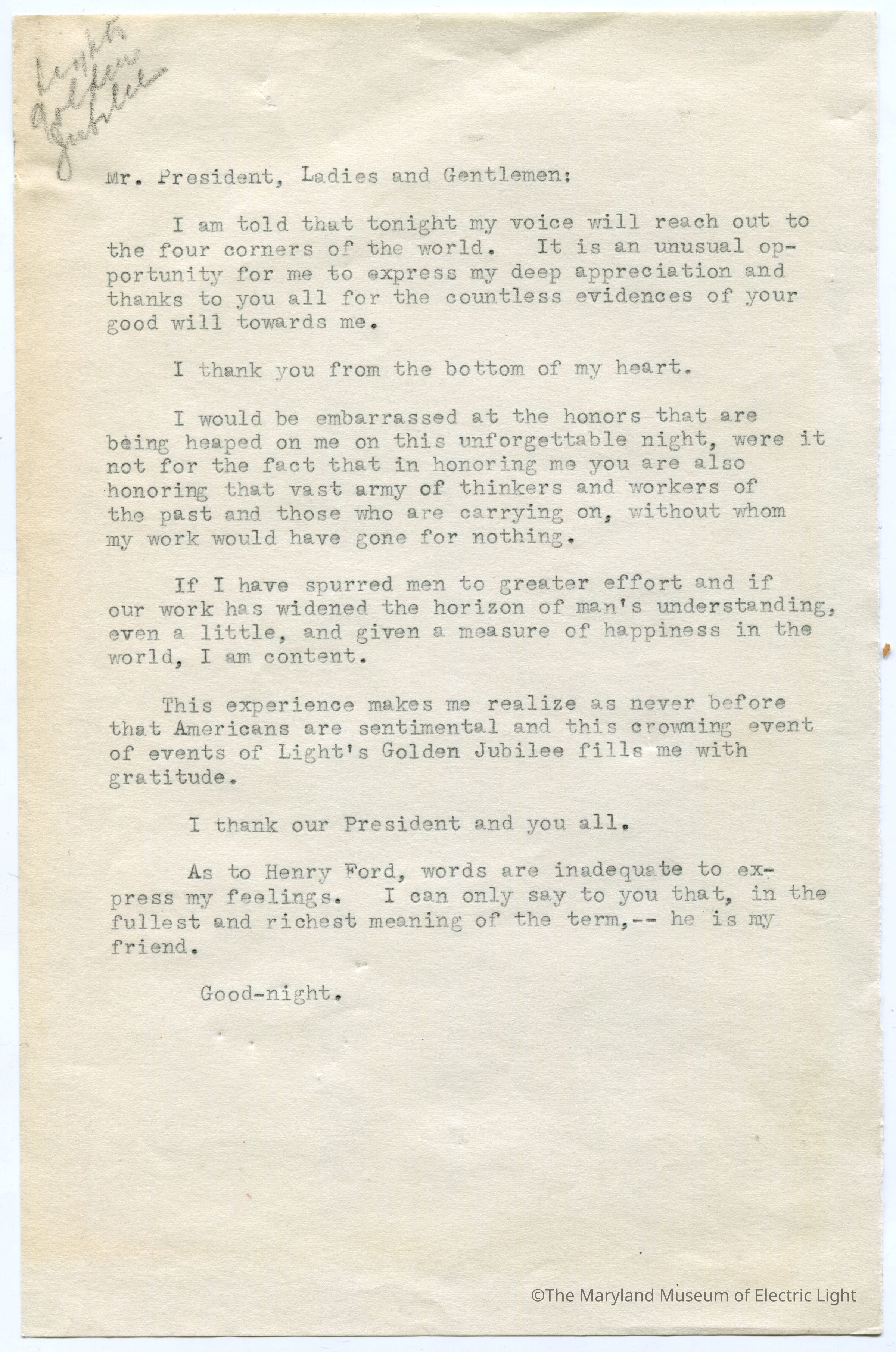 Original manuscripts, typed copies and edits to Thomas A. Edison speech at the Golden Jubilee celebration of Edisons Electric Light 10-21-29. Archive consists of 3 versions of the speech, with #3 being the final selected manuscript to be read to the tenders of the opening ceremonies of The Edison institute on Edison's electric light golden jubilee on 10-21-1029. The manuscripts are in the hand of T A Edison’s son Charles. It is unknown if Charles fully wrote the three speech drafts without T A Edison’s input or if this was a collaborative effort with Charles handling the writing responsibility.