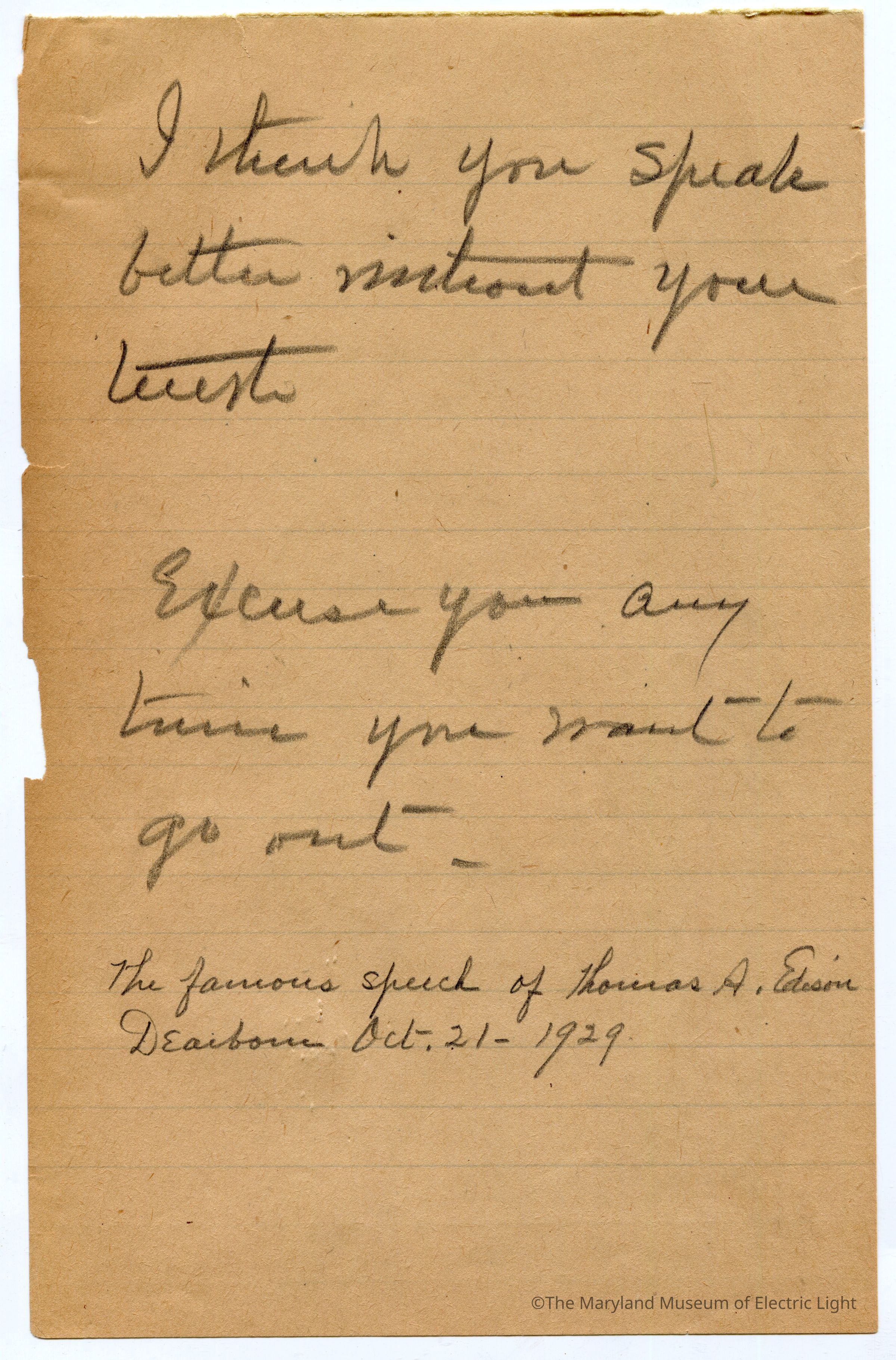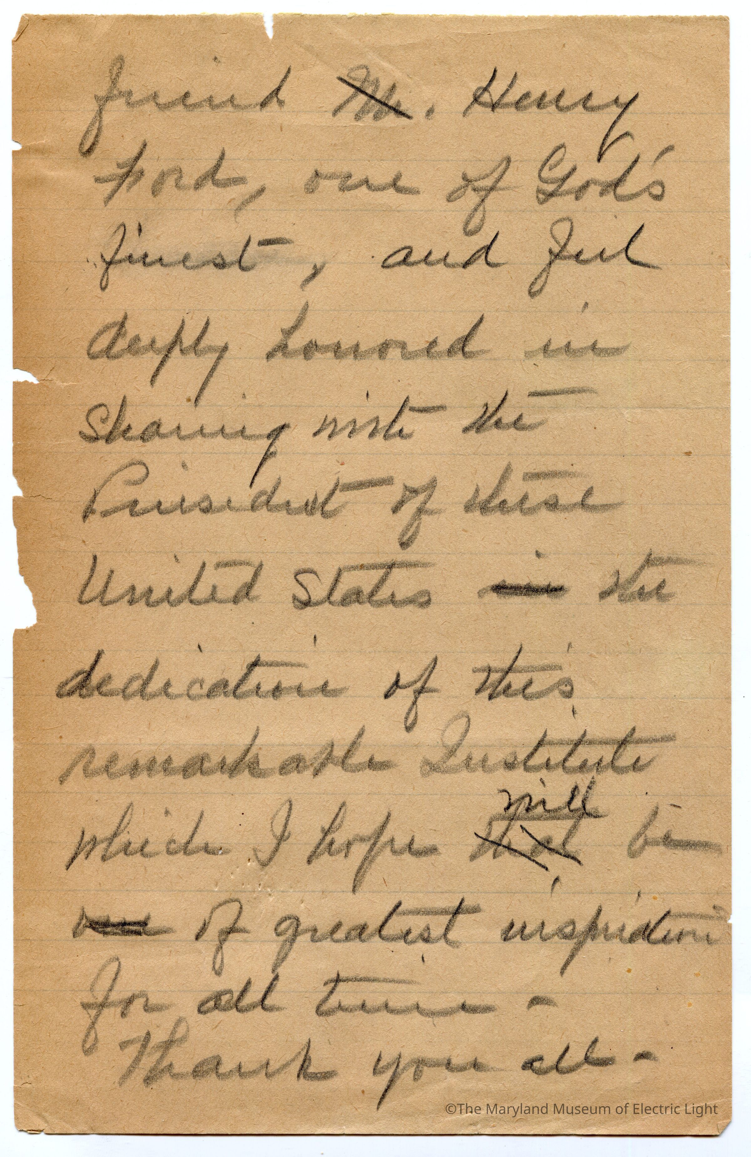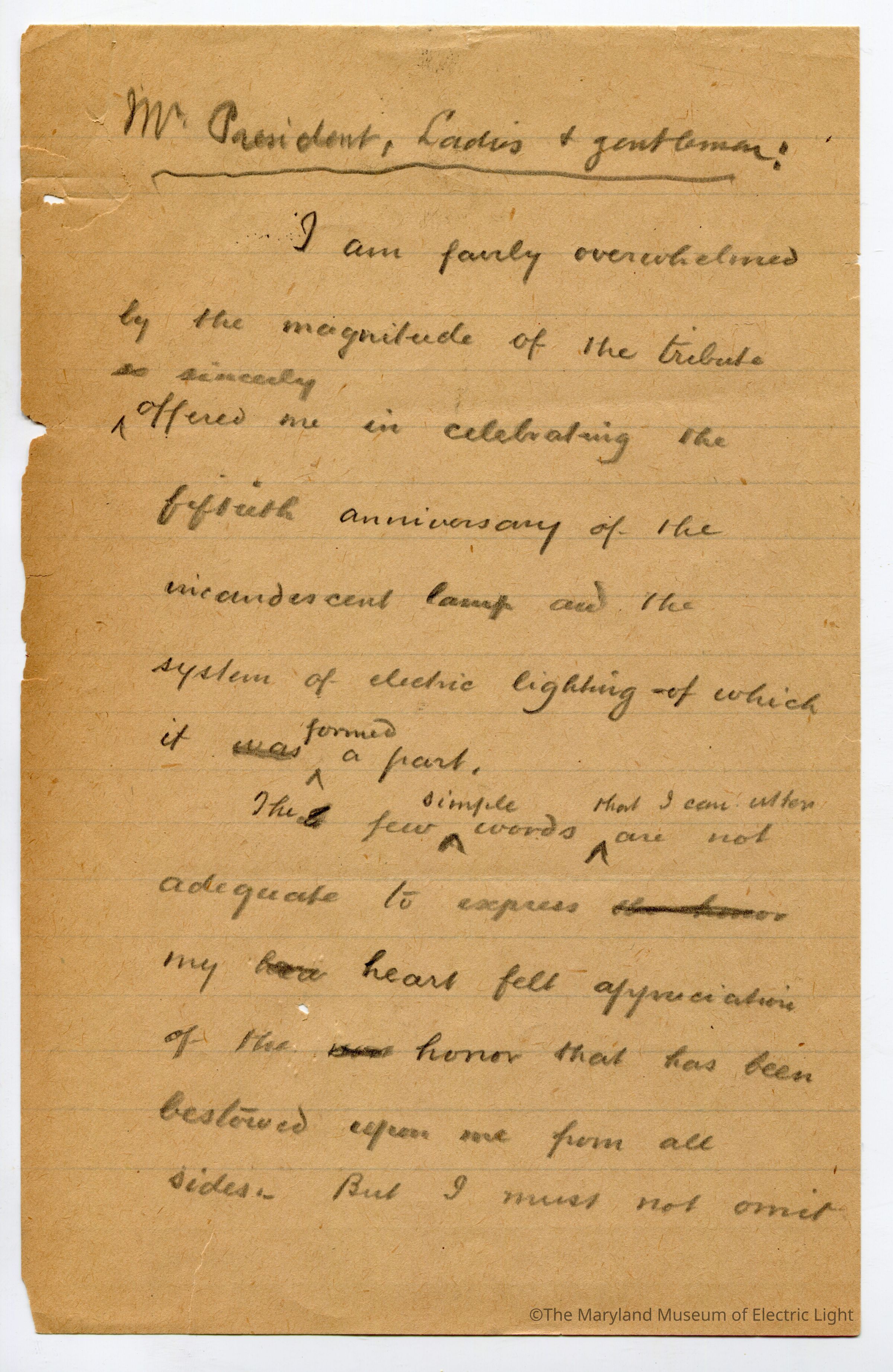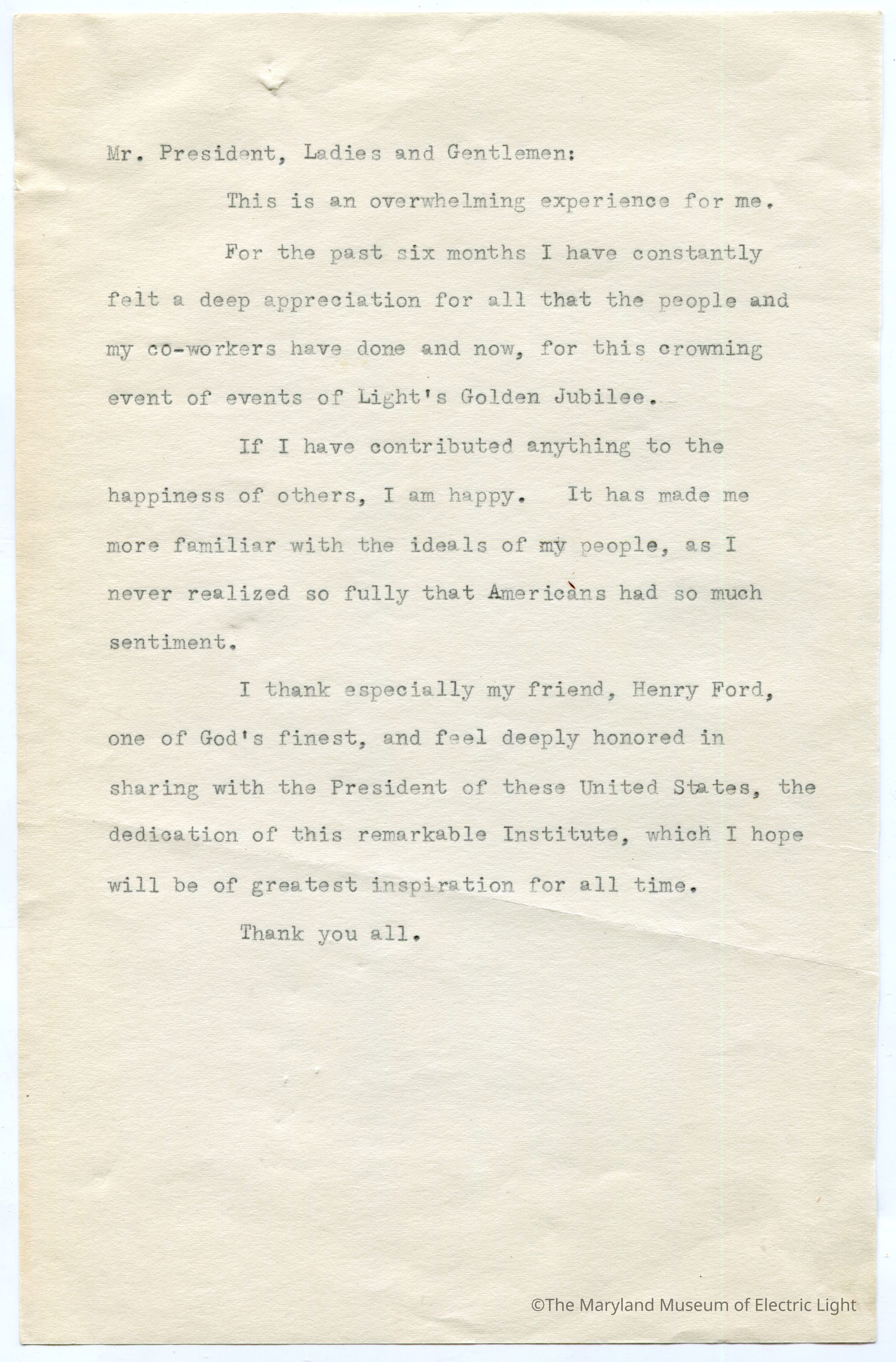 Original manuscripts, typed copies and edits to Thomas A. Edison speech at the Golden Jubilee celebration of Edisons Electric Light 10-21-29. Archive consists of 3 versions of the speech, with #3 being the final selected manuscript to be read to the tenders of the opening ceremonies of The Edison institute on Edison's electric light golden jubilee on 10-21-1029. The manuscripts are in the hand of T A Edison’s son Charles. It is unknown if Charles fully wrote the three speech drafts without T A Edison’s input or if this was a collaborative effort with Charles handling the writing responsibility.