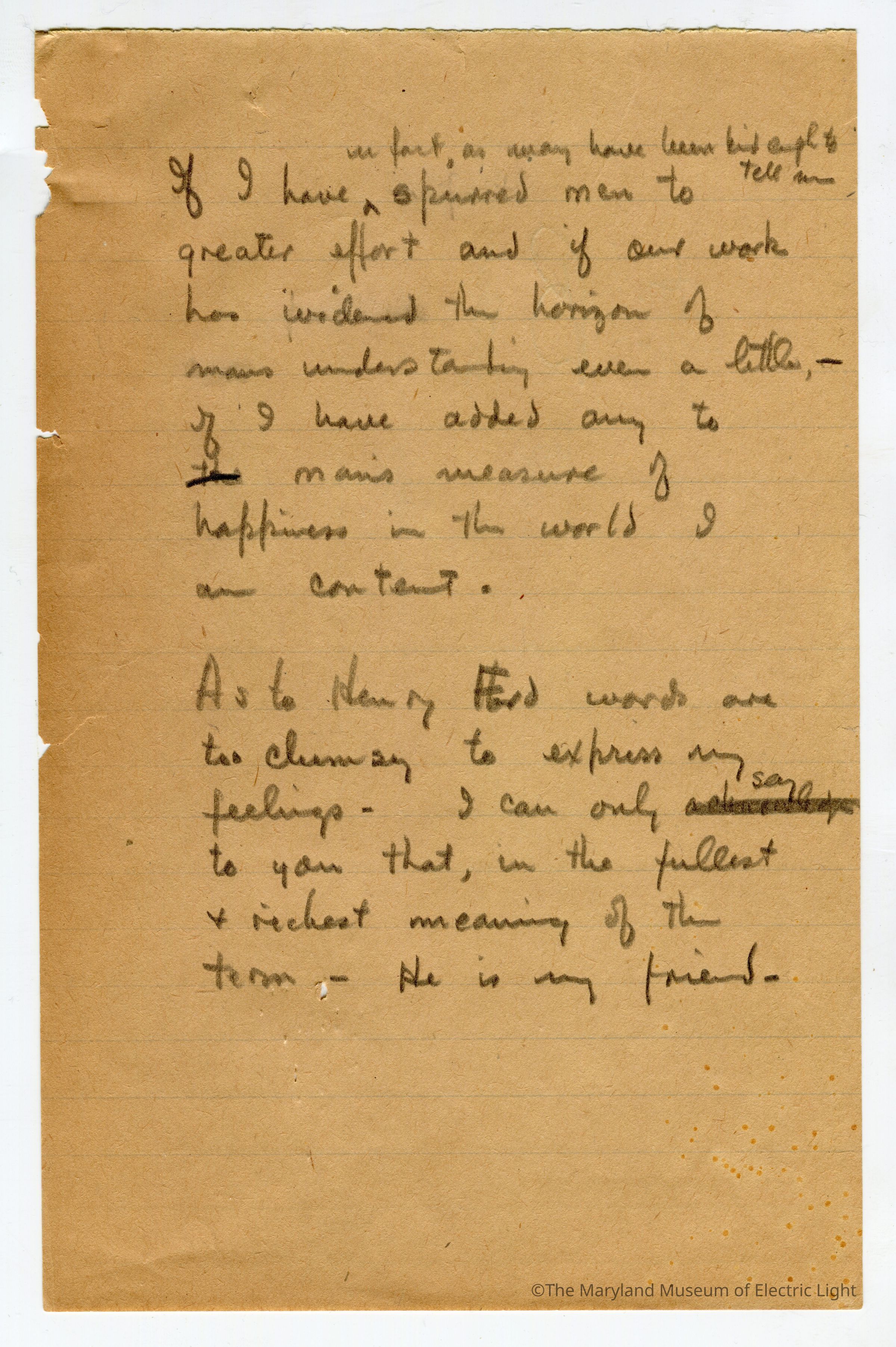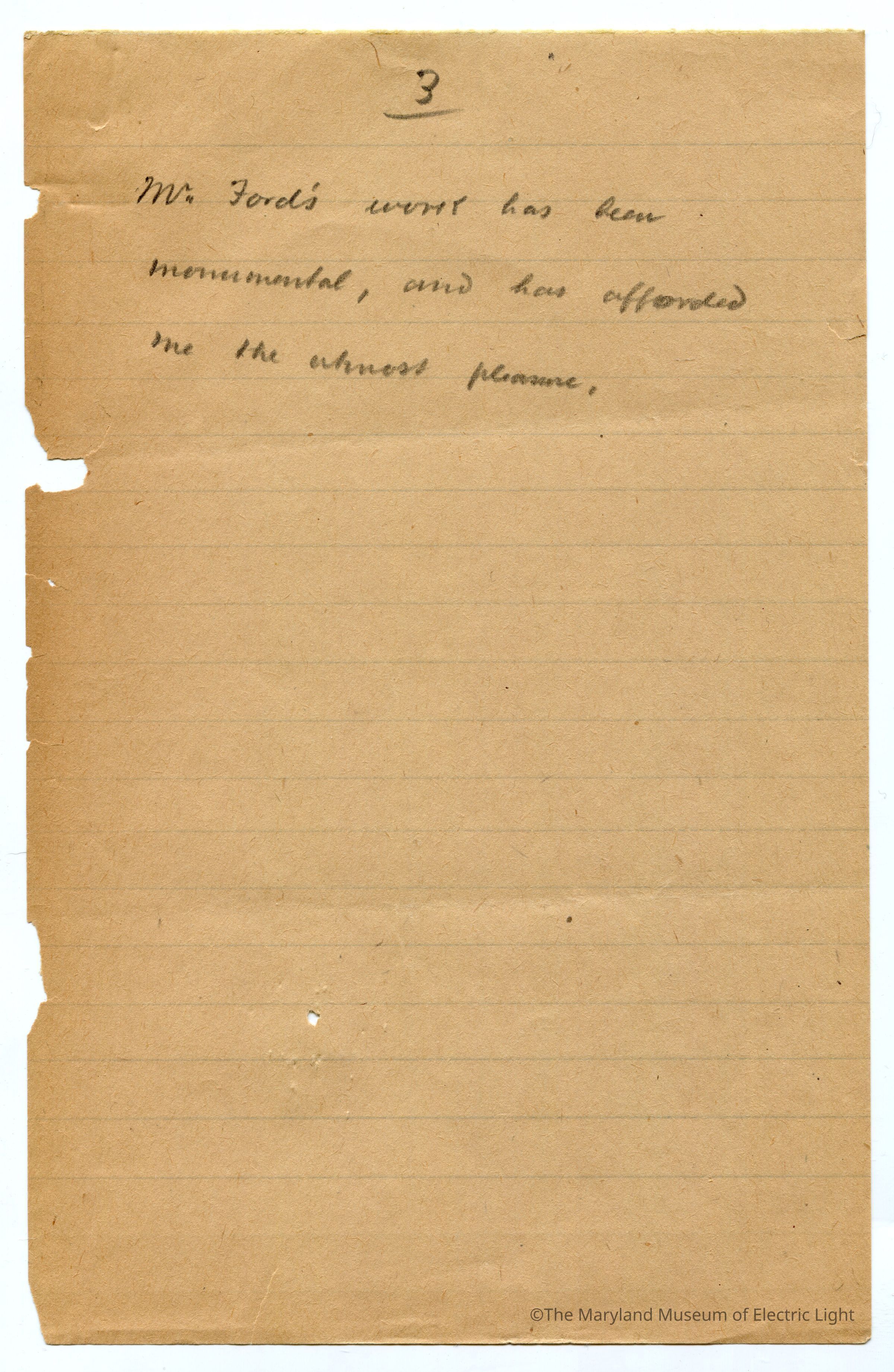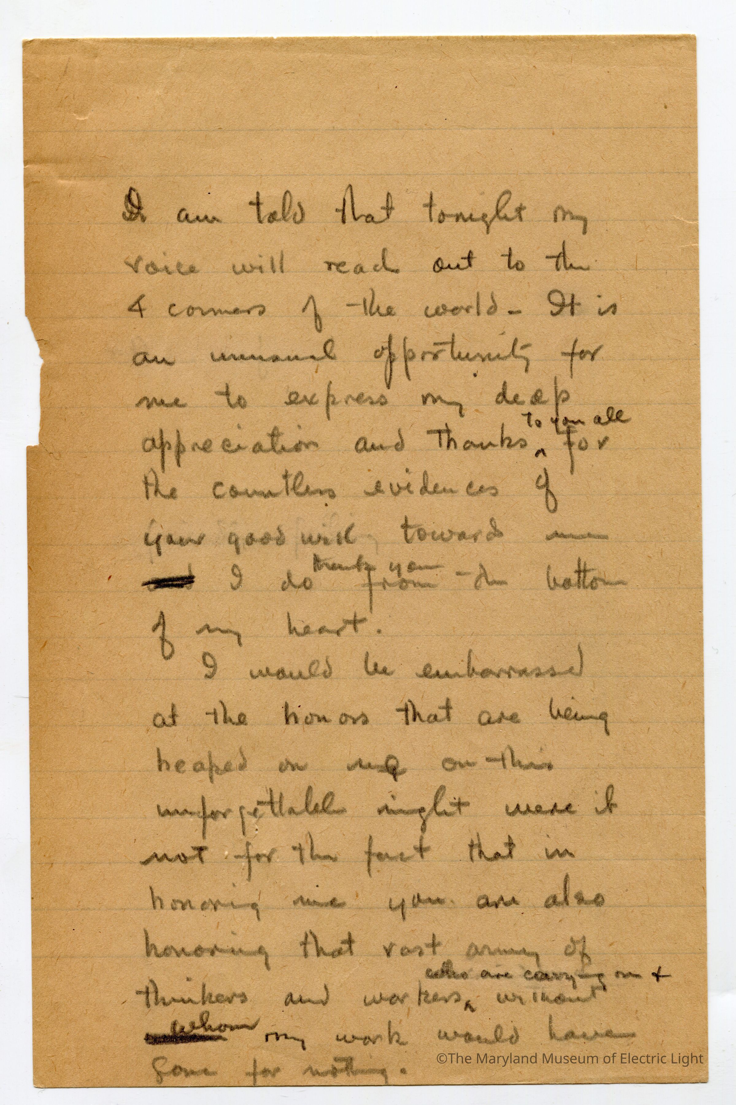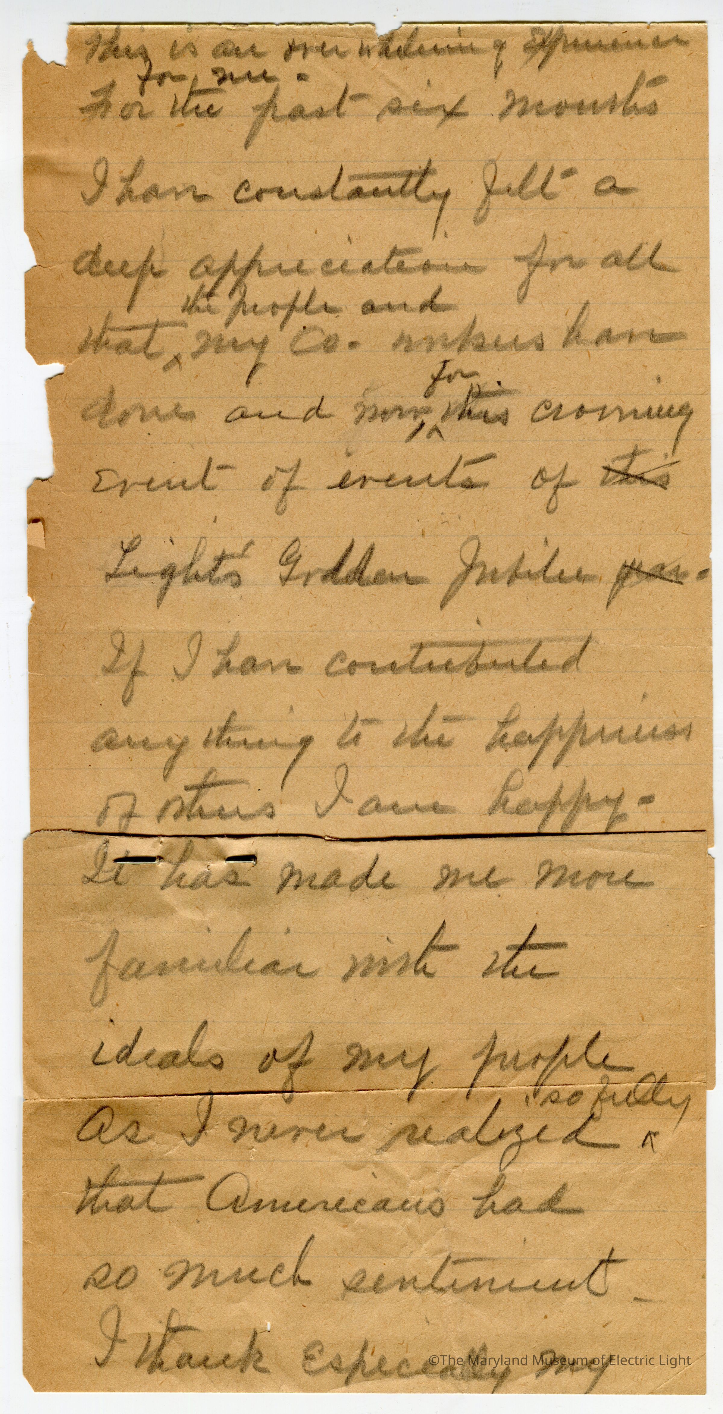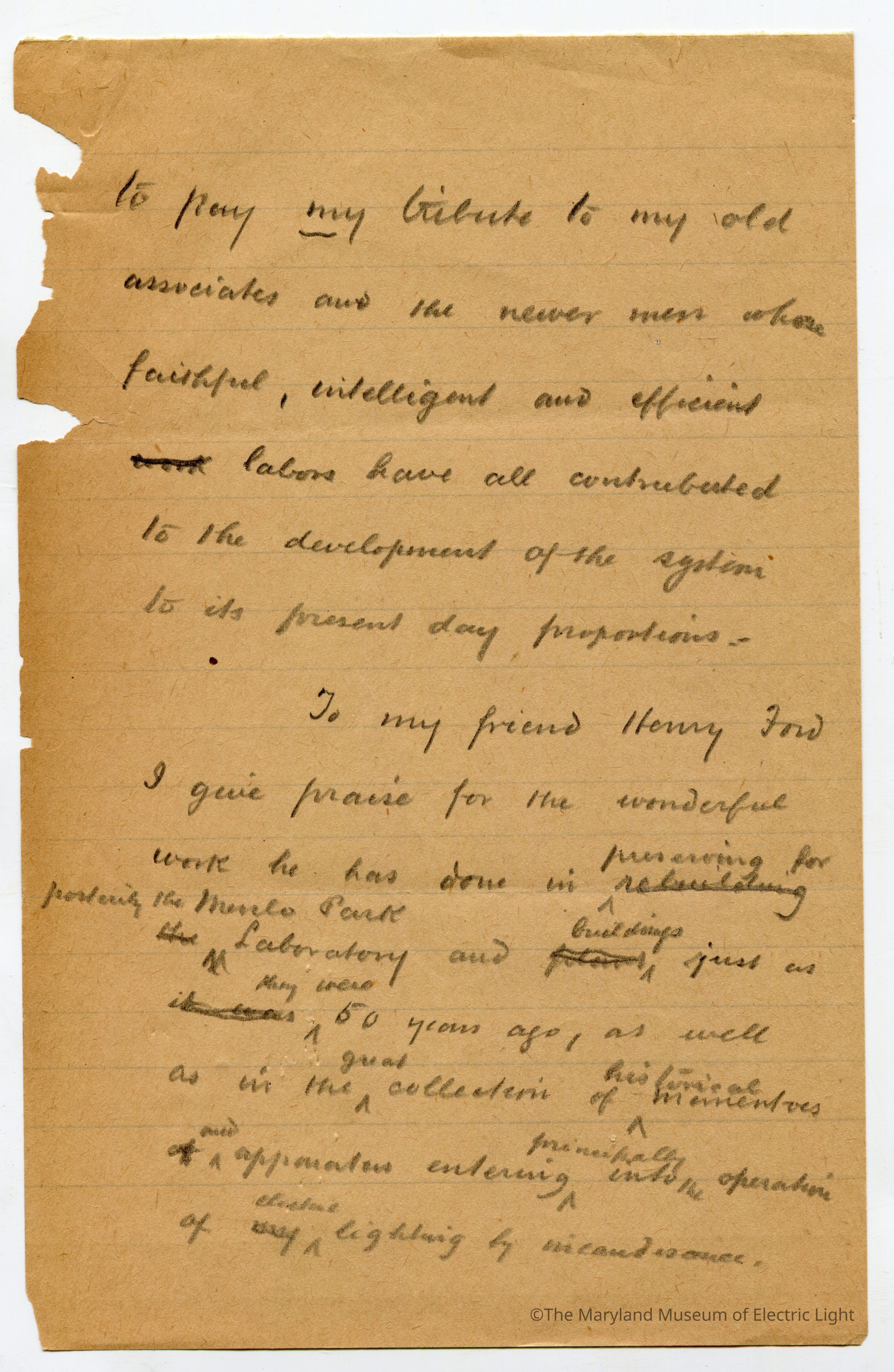 Original manuscripts, typed copies and edits to Thomas A. Edison speech at the Golden Jubilee celebration of Edisons Electric Light 10-21-29. Archive consists of 3 versions of the speech, with #3 being the final selected manuscript to be read to the tenders of the opening ceremonies of The Edison institute on Edison's electric light golden jubilee on 10-21-1029. The manuscripts are in the hand of T A Edison’s son Charles. It is unknown if Charles fully wrote the three speech drafts without T A Edison’s input or if this was a collaborative effort with Charles handling the writing responsibility.