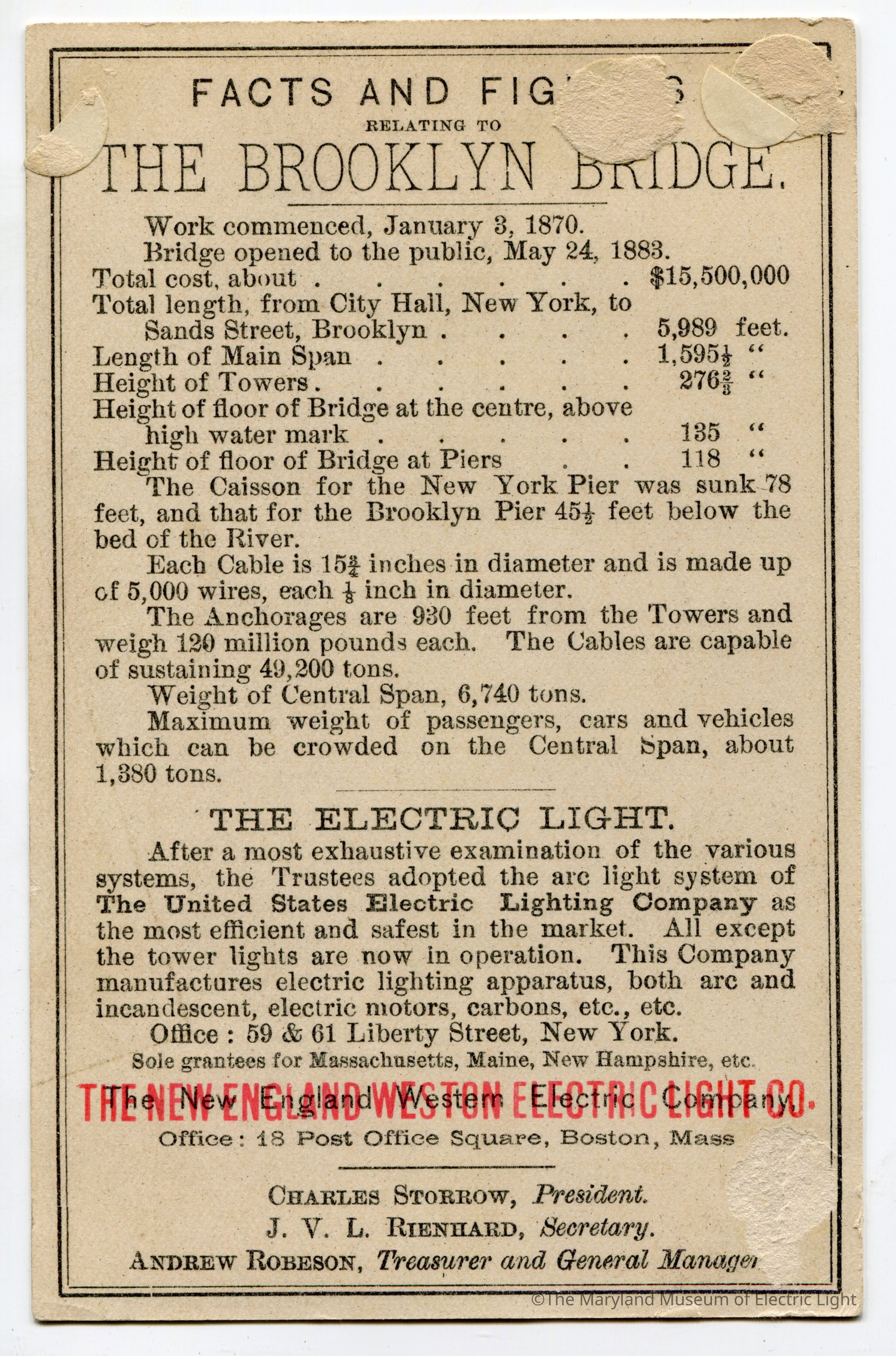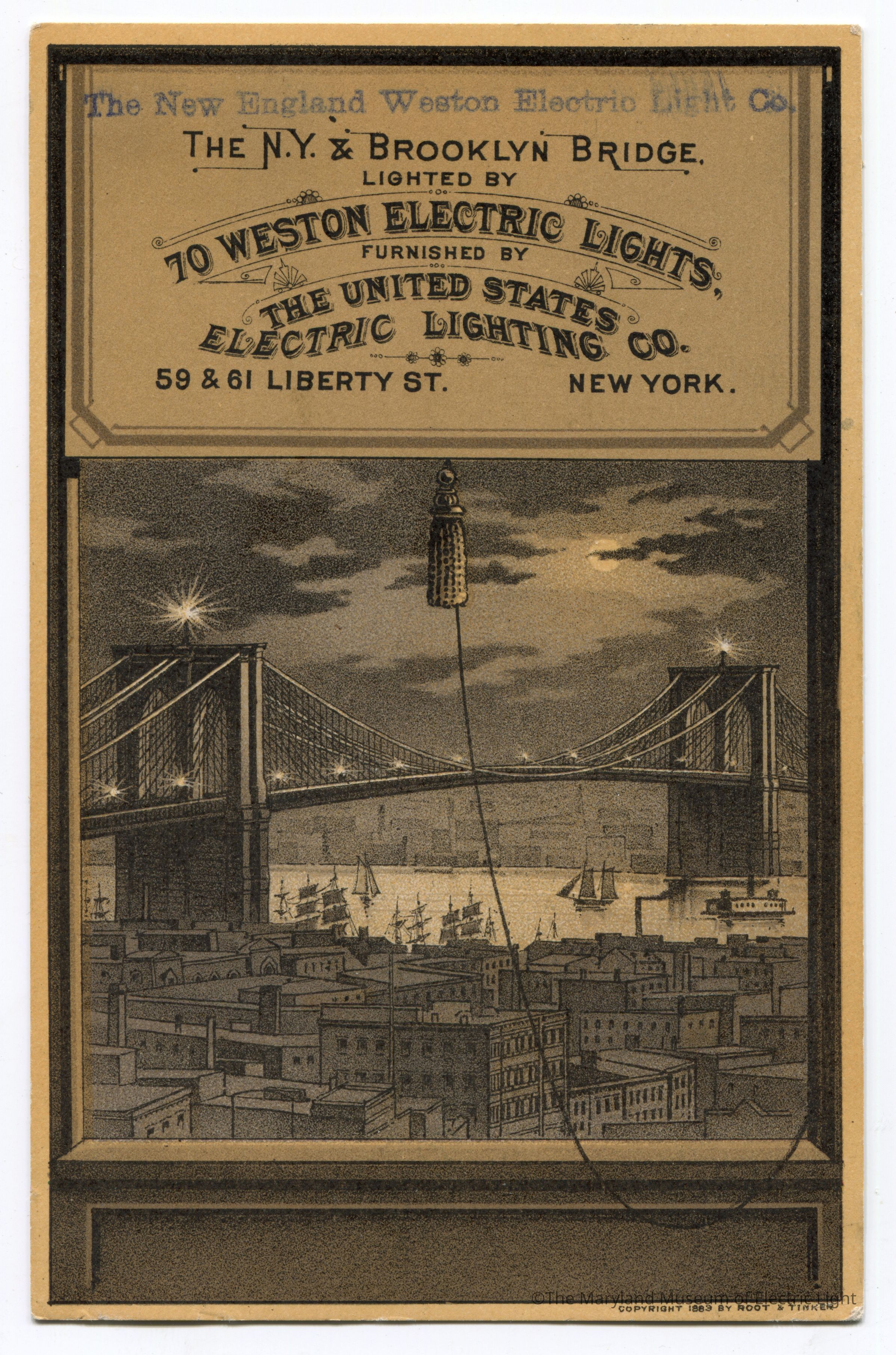 Trade card advertising the Brooklyn Bridge lit by Weston lamps by United States Electric Lighting Co.