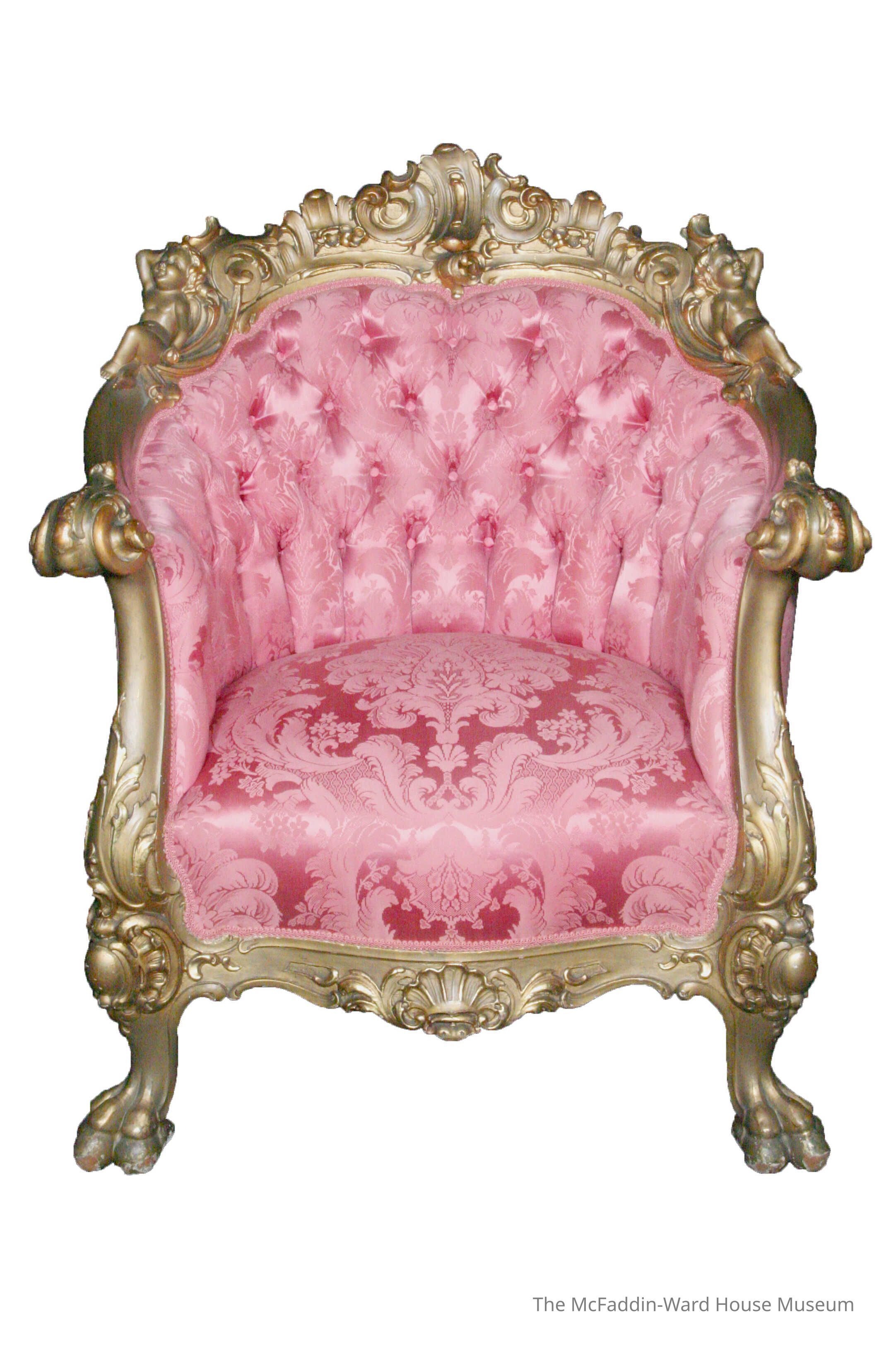 Wooden tub-style arm chair with upholstered seat and back. Chair is upholstered in pink damask and the back is tufted. The wood is carved and the 2 front feet of the chair are claw shaped. All four feet of the chair have metal casters. In the carving along the seat back are two reclining cherubs.
