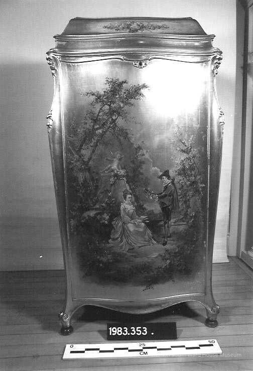 Standing, wooden phonograph and phonograph cabinet. The wood has been finished and painted in vernis martin on all sides. The painted scenes are either floral or pastoral in nature with female and male figures standing and/or sitting in natural setting wearing Renaissance-style clothing. The scenes either have the couple dancing or the man playing a musical instrument. The front of the cabinet that has two compartments that each have 2 doors. Inside the top compartment are 3 shelves. Inside the bottom compartment is one shelf and 4 compartments that hold lettered phonograph albums (16 total). The phonograph also opens at the very top with a horizontally hinged door to reveal the phonograph turntable. There is a removable crank arm that fits into a small hole on the viewer's right side of the phonograph.Made/Created