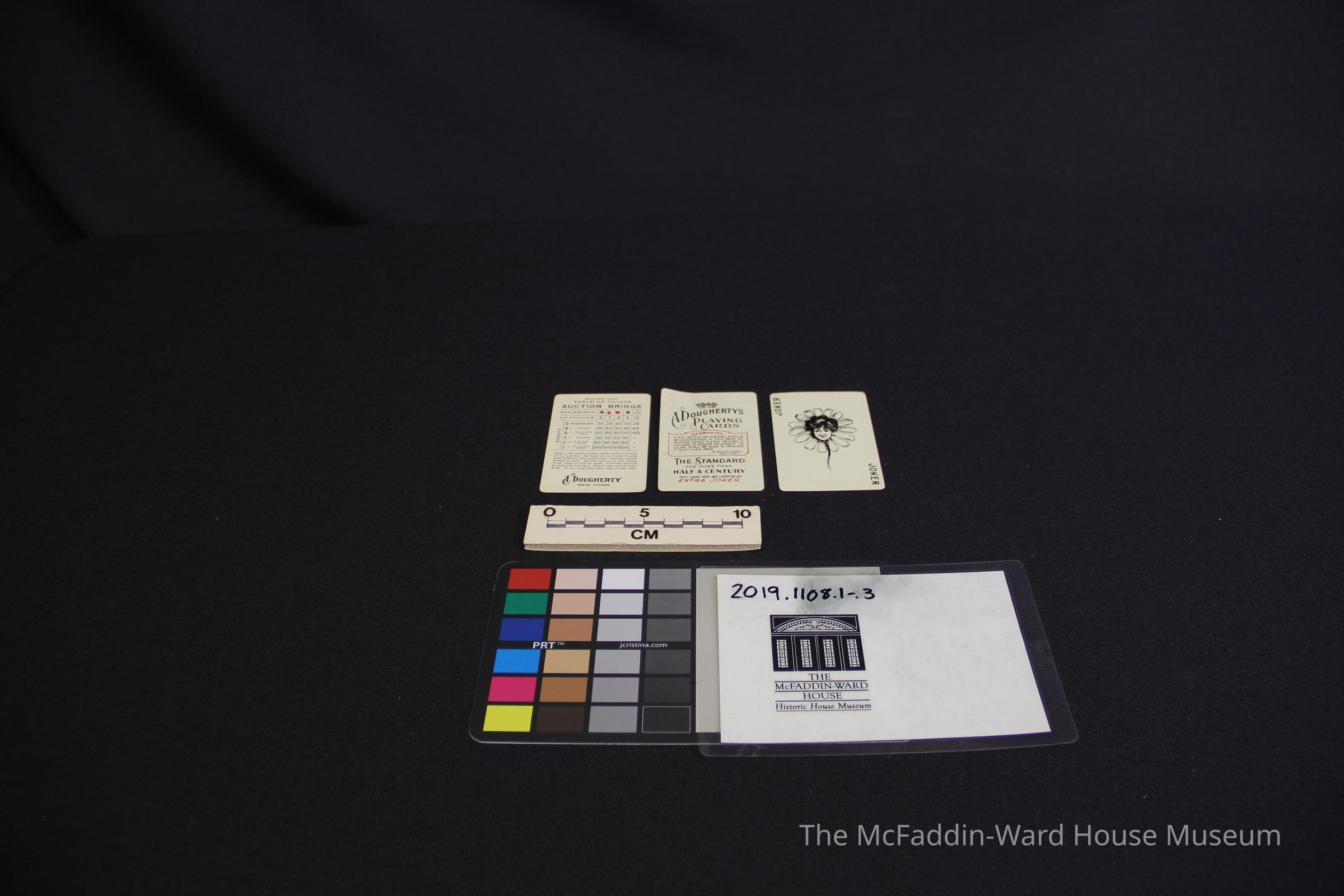 (.1) playing card, paper, Golden Iris flower printed design, "A. Dougherty's Playing Cards", (.2) playing card, paper, bridge rule card, (.3) playing card, paper, Golden Iris flower printed design, "Joker"Context