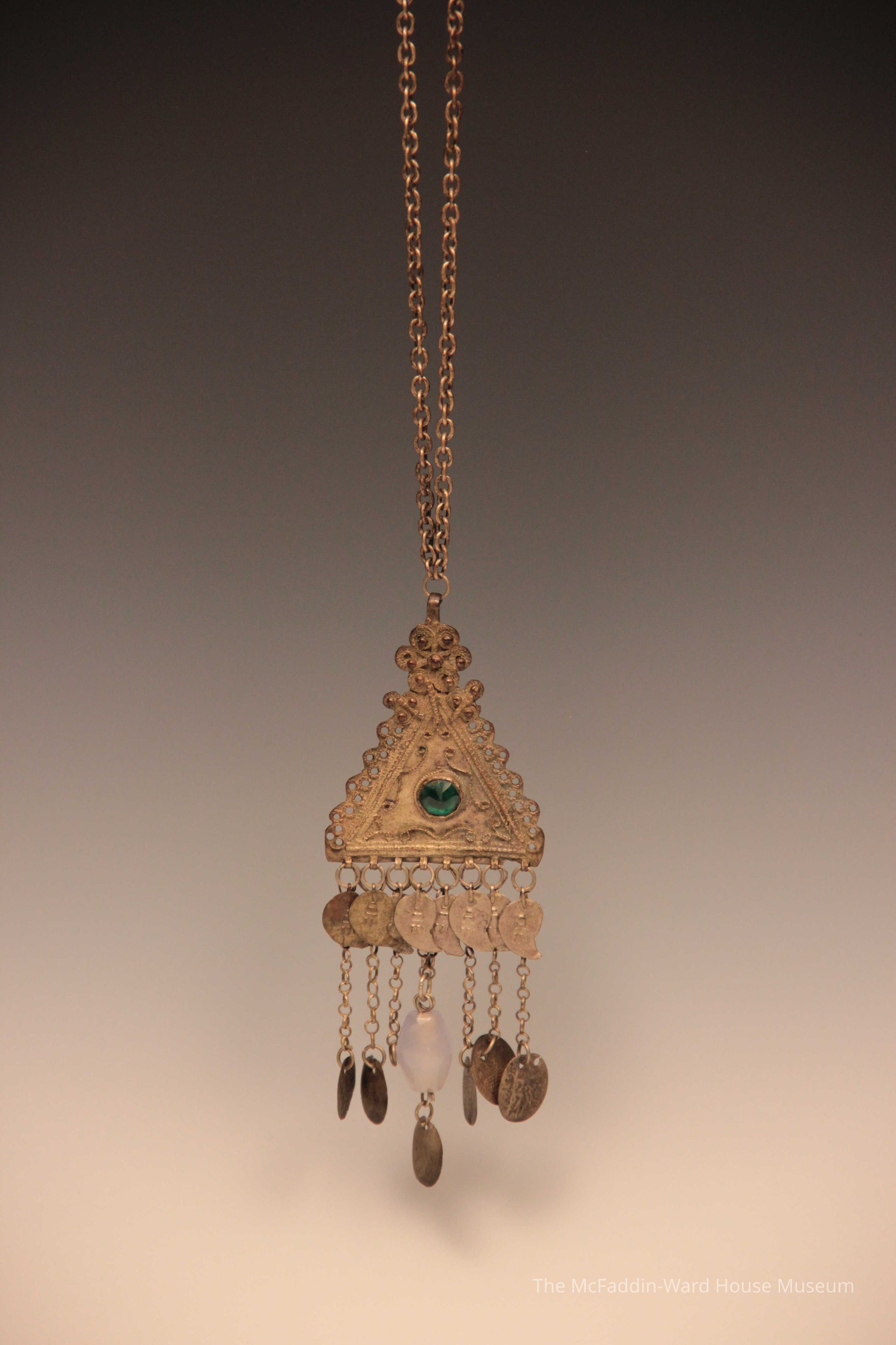 Necklace composed of metal chain with triangular penant with a green stone or glass in the middle. From this penant dangles flattened "coins" and one nearly white oval glass bead.