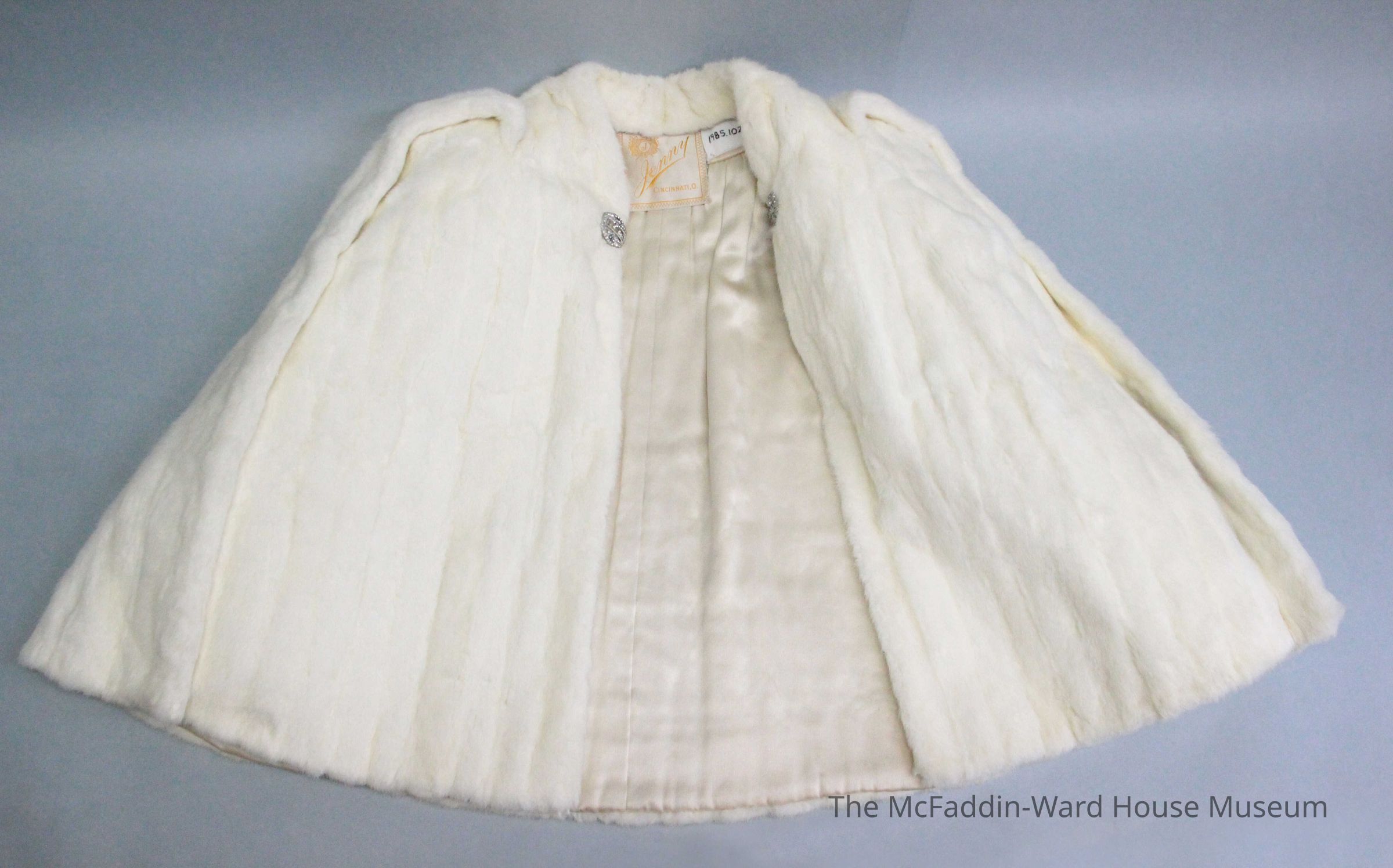 White waist length cape with crepe lining, 2 arm holes, clasp with hook at neck with rhinestones on both; OCW monogram = Ouida Caldwell WattsMade/Created