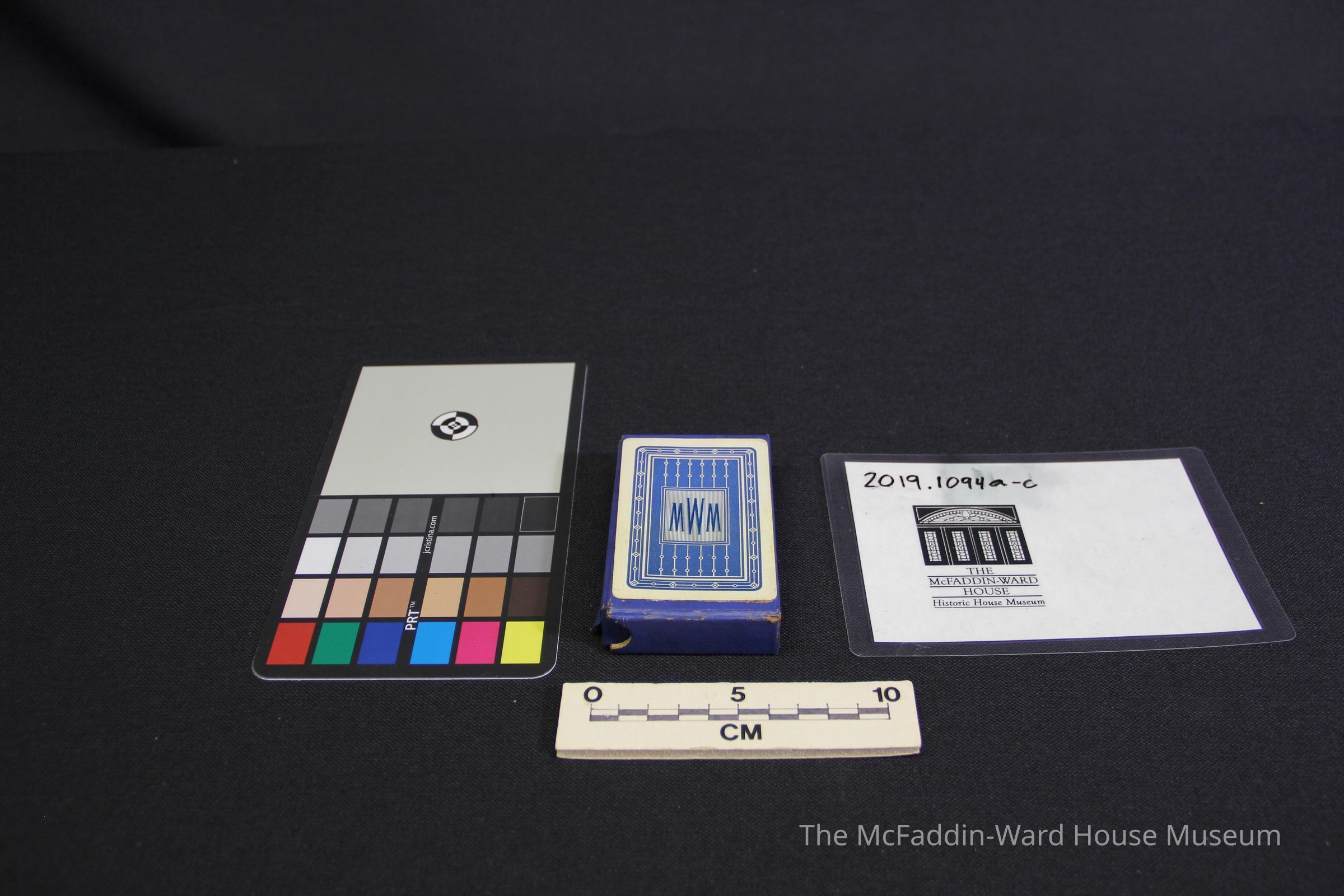 Deck of 52 (a) red playing cards, blue cardboard (b) case and (c) case lid embossed with gold-toned "IDEAL/ PLAYING CARDS/ NON-REVOKE/ FRENCH WHIST SIZE/ SERIES "G"/ GOLD EDGES- LINEN FINISH/ GEORGE B. HURDS & CO. / NEW YORK, U.S.A. / PATENT APPLIED FOR." (c) lid has card attached with blue striped pattern & blue "MWM" monogram.Context