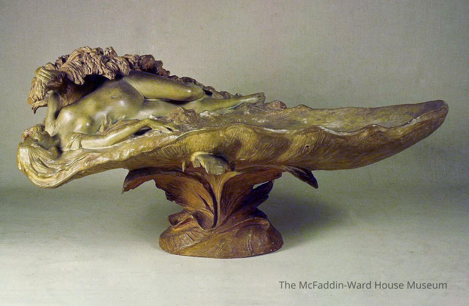 Leaf design base supports shell like bowl; reclining nude female figure at left; bowl at right; greenish-gold