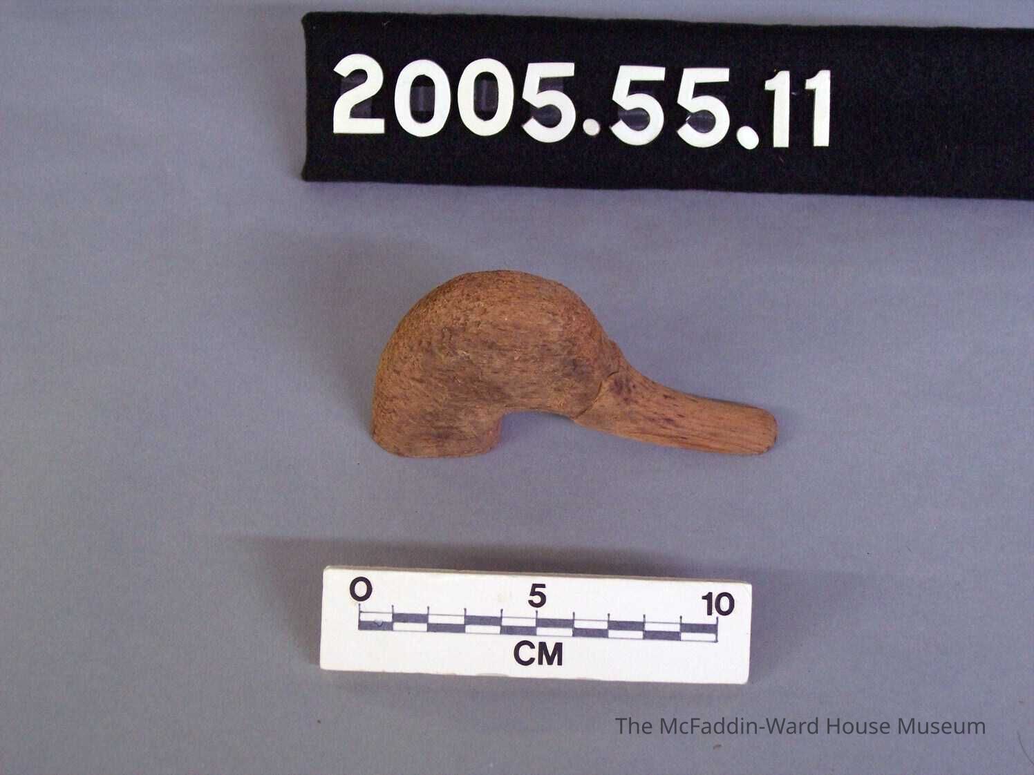 Unstained, carved duck head that is flat at the bottom of the neck and the beak is defined where it attaches to the head.