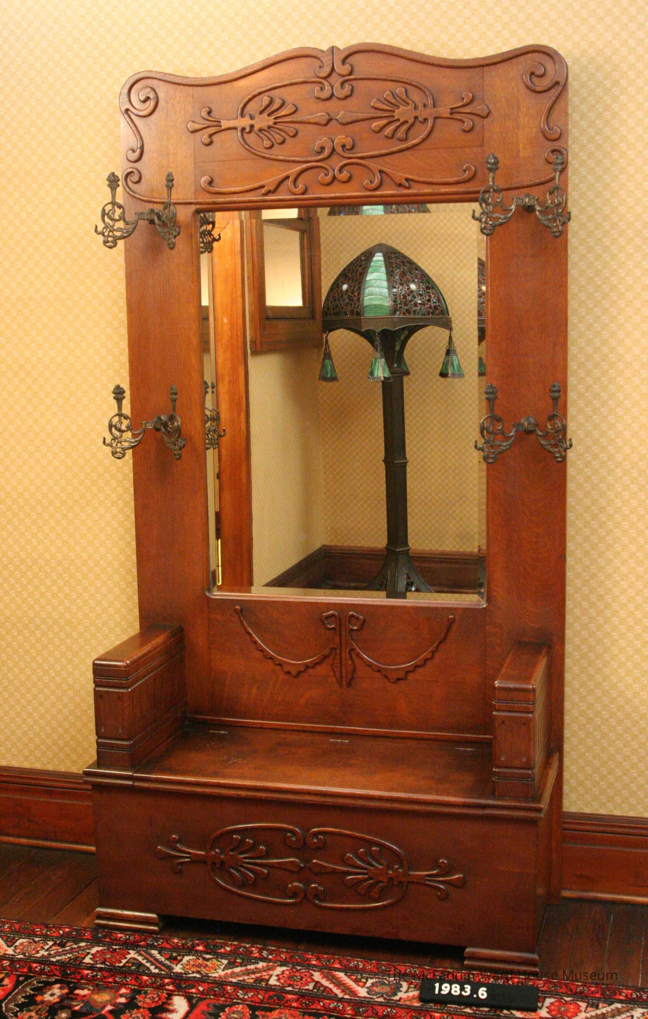 Bench, mirror, hat rack, hinged seat opens into storage space, 2 arm rests, cut wood applied decoration, beveled glass mirror.Made/Created