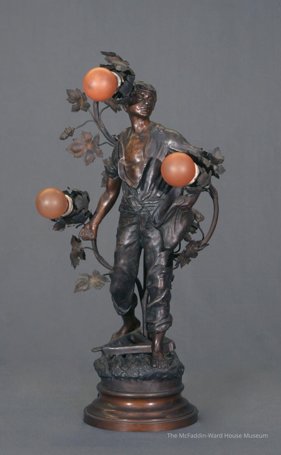 Figure of peasant youth sowing seeds; bag of seeds held in left arm throwing with right arm; barefoot, standing on plowed earth; grapevines surround figures hold three light bulbs; all mounted on base.