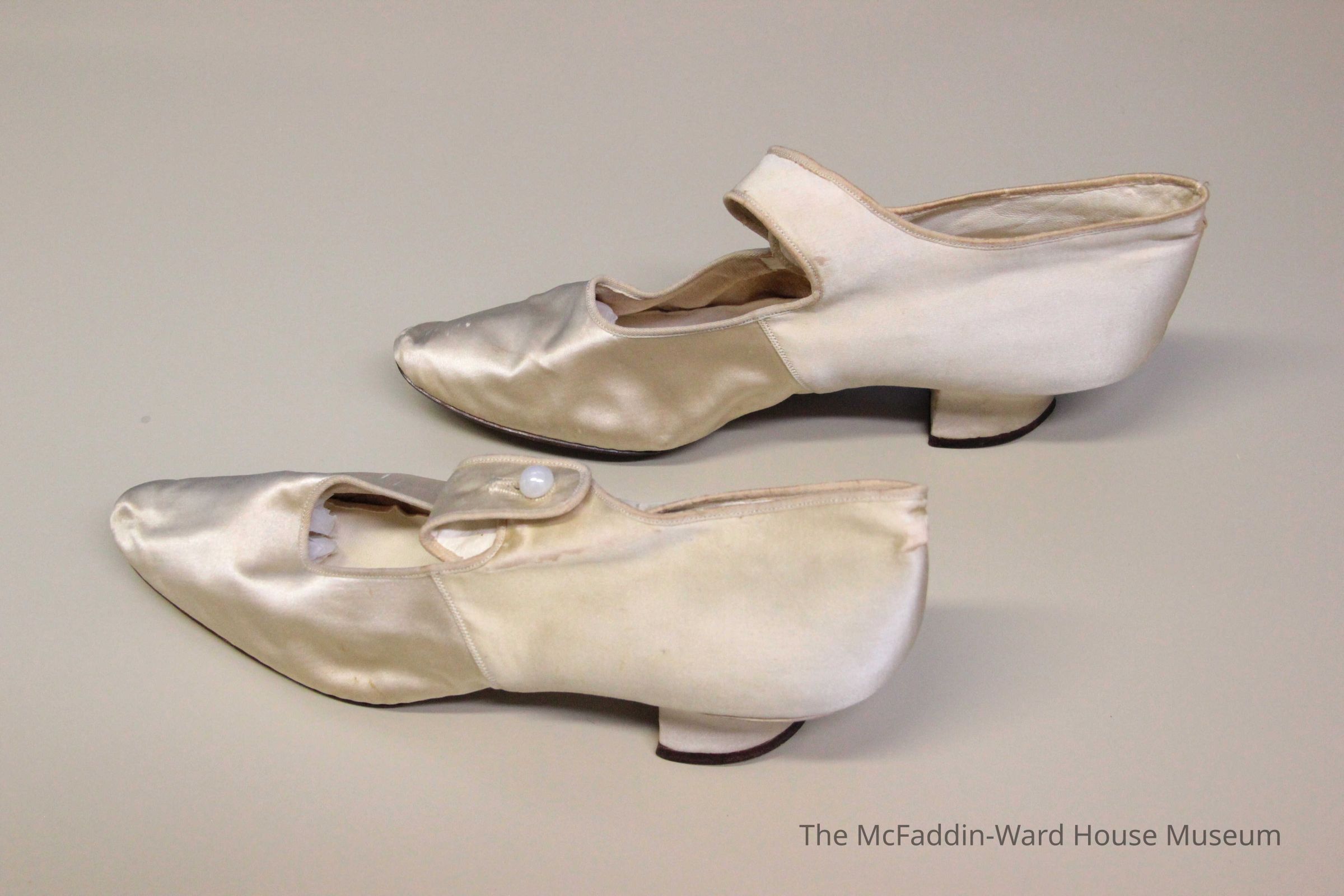 Ida's wedding shoes in a cream colored slipper satin with a pearl button and a Louis-style heel. In very good condition.