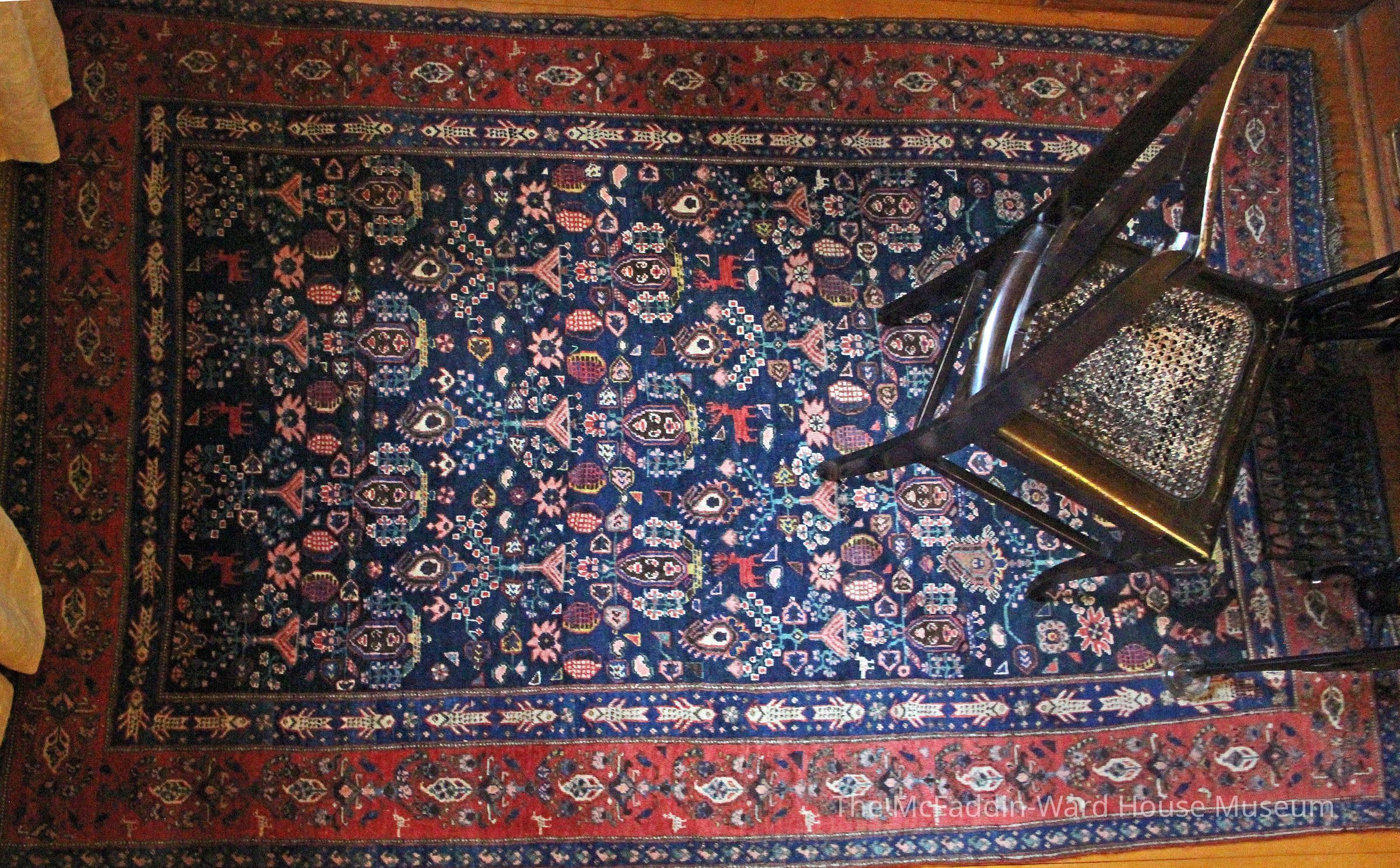 Kurdish tribal rug, wool, deep blue field with all-over pattern of red deer, botah (paisley), flowering trees, and rosettes, surrounded by fish and scarlet border of small birds and botahs, outlined with "barber-pole" effect.Made/Created