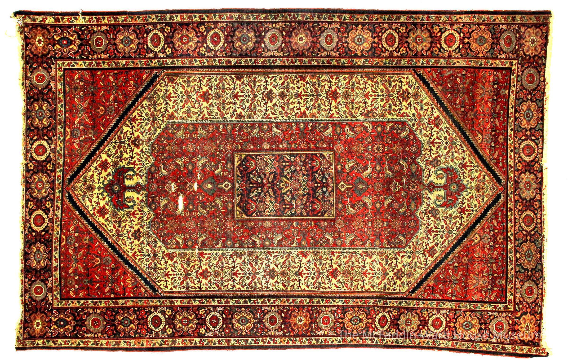 Rug, Kerman/Kirman, wool, red field with abrash, with central medallion enclosed in a soft yellow hexagonal shape, bordered with a black "running dog" pattern. Rug has border of stylized flowers, with two (2) blue guards depicting flowers.Made/Created