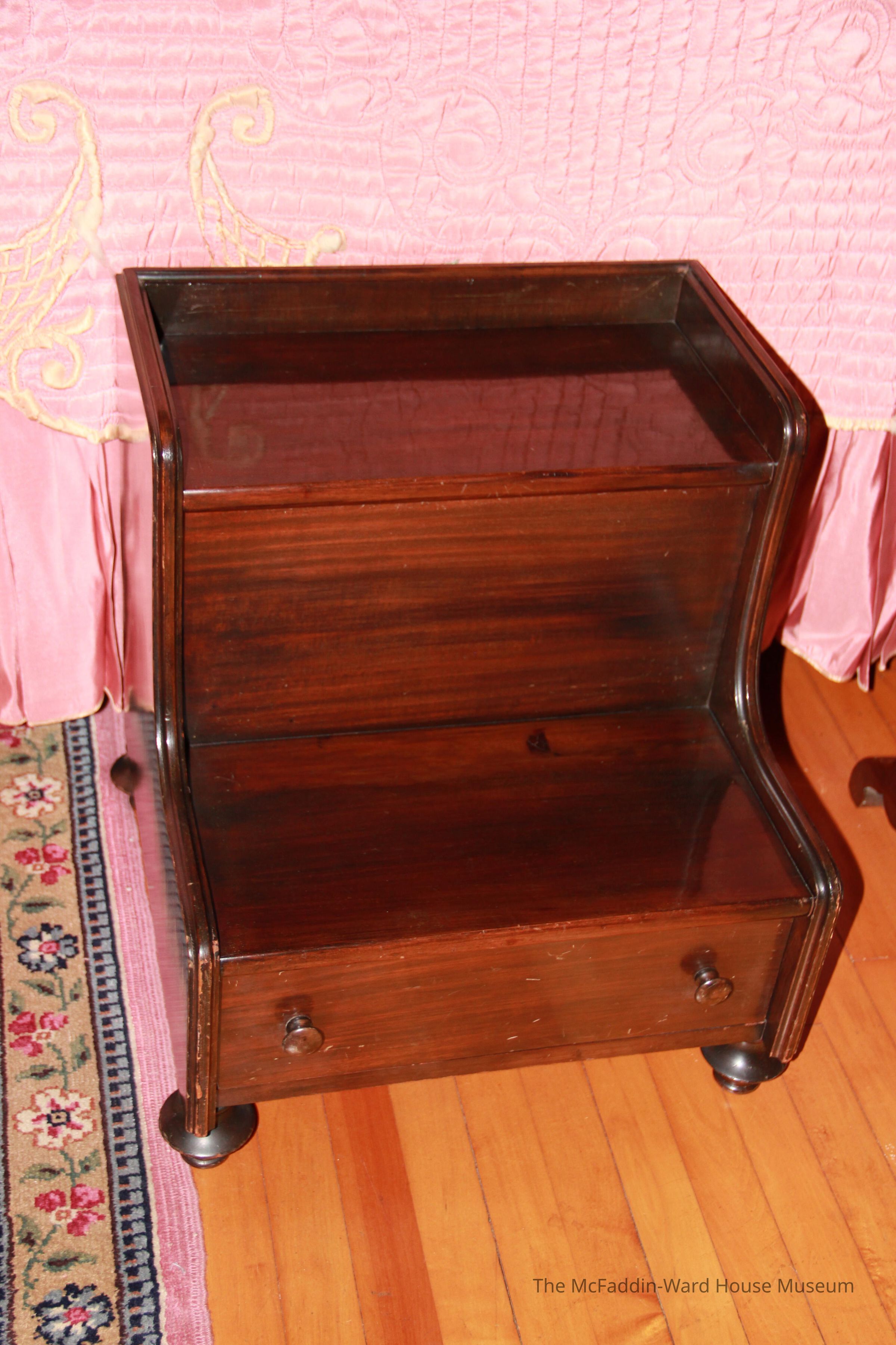 Two steps with molded border. Lower step with single drawer and raised on round turned legs.