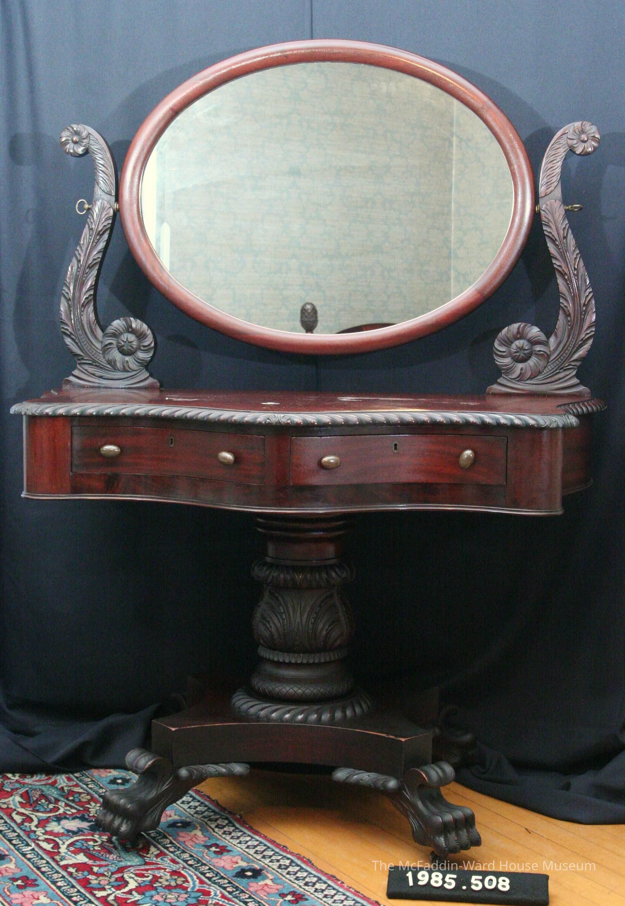 Serpentine front table on ornately carved pedestal with acanthus leaf motif; four paw feet; oval mirror swivels on leaf and scroll braces; table top has two drawers with solid oval brass pulls; glass cover on the table top.Made/Created