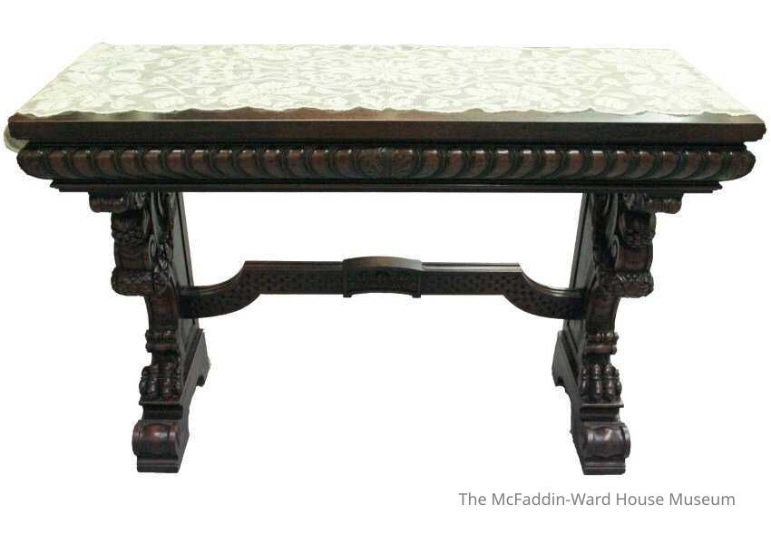 Rectangular; top has gadrooned apron on two trestle supports carved with swags, scrolls, and pomegrante motifs; on paw fee and a shaped traverse.