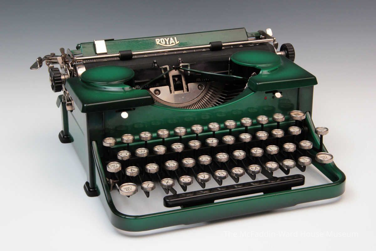 Green portable model, glass topped round keys; in dark brown faux alligator cloth covered case.Made/Created