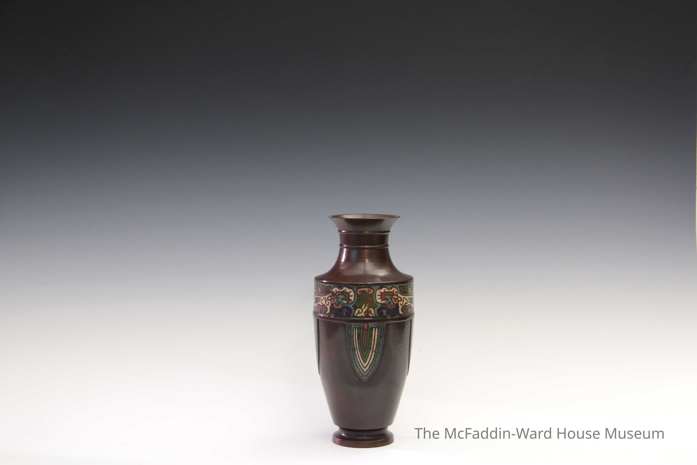 Slender, amphora-shaped, with cloisonne t'ao-tia mask decoration at base of neck.