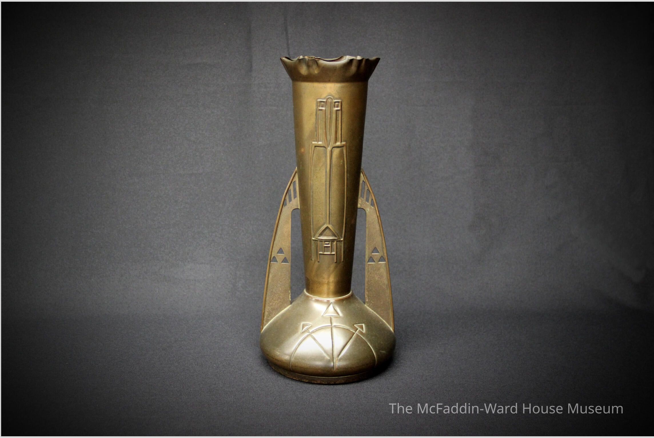 Squat Base with long conical shaped neck with scalloped rim; applied arched handles with pierced triangles and vertical bands; both sides of base incised with semi-circle over three arrows; neck has raised geometric pattern on both sidesMade/Created