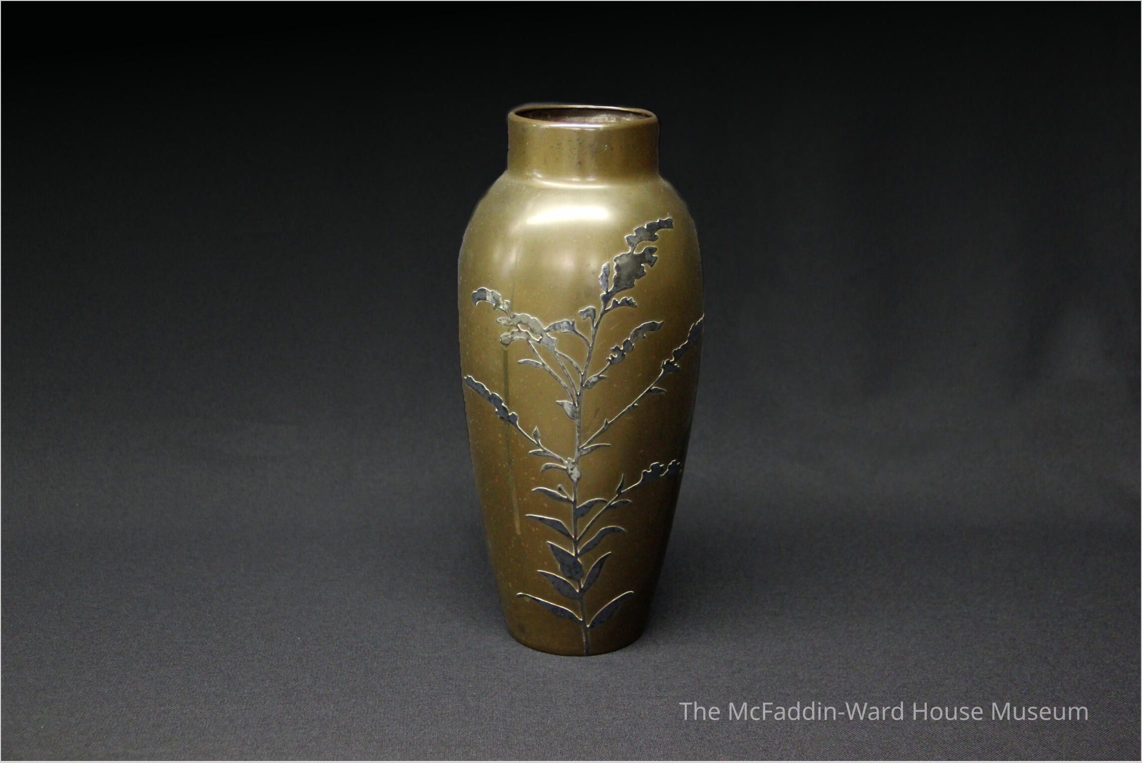 Jar-shaped: bronze body with applied silver decoration in form of flower stalk.