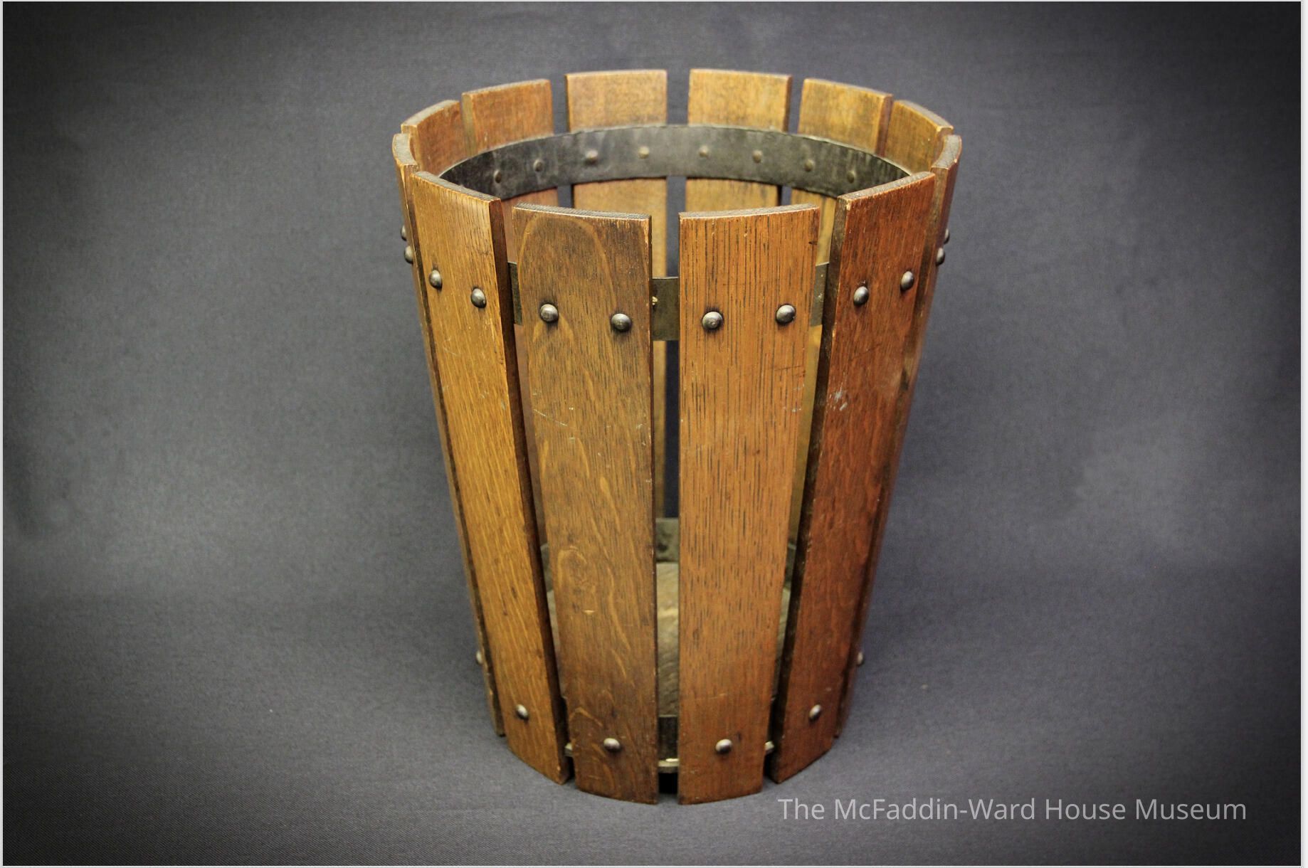 Vertical slats rivetted to 2 circular steel straps; wood bottom; tapering cylinder.
