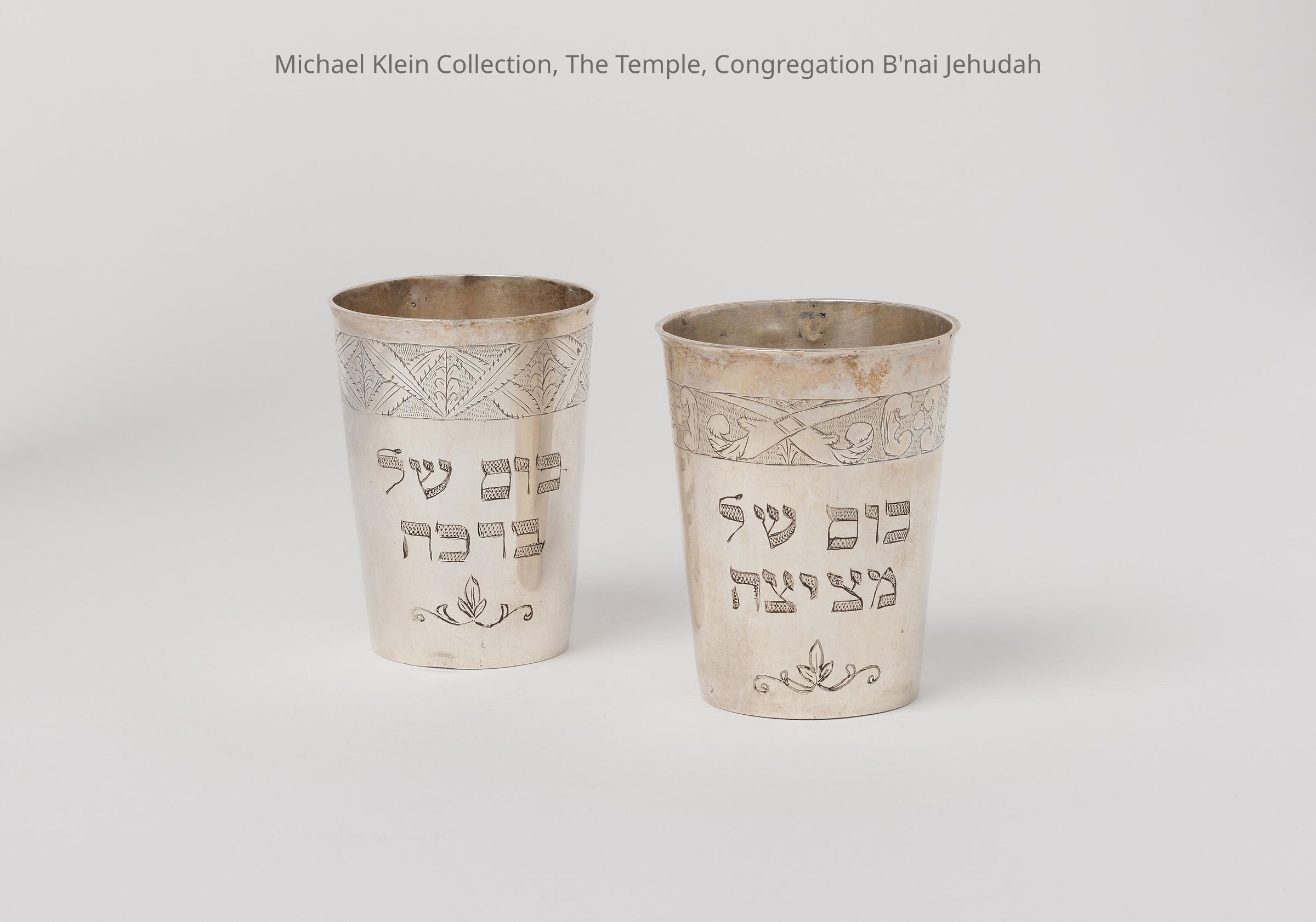 Pair of silver goblets for Brit Milah ceremony. Specifically designed nesting goblets. One goblet is for wine, the other is for spitting the blood, each inscribed with its purpose.Made/Created
