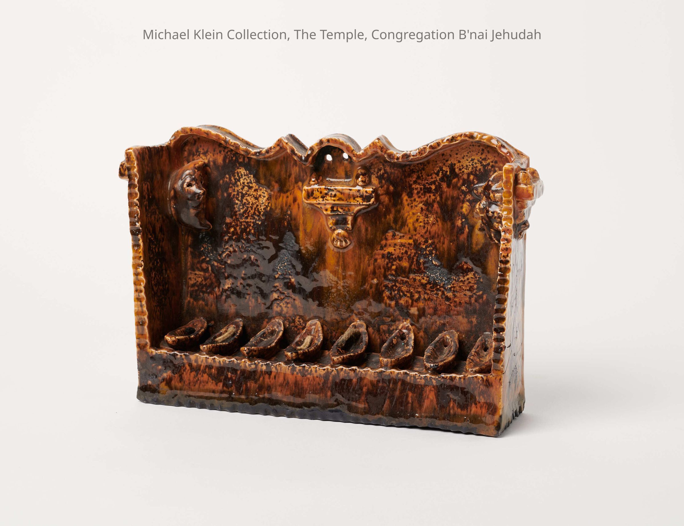 Bench form. Decorated with the sun and moon flanking the central bracket below the shaped upper rim. Oil containers are in the shape of elongated boats. Similar lamps can be found in the catalog of the Judaica Koelniches Stadt Museum, pp. 27, 428.Made/Created