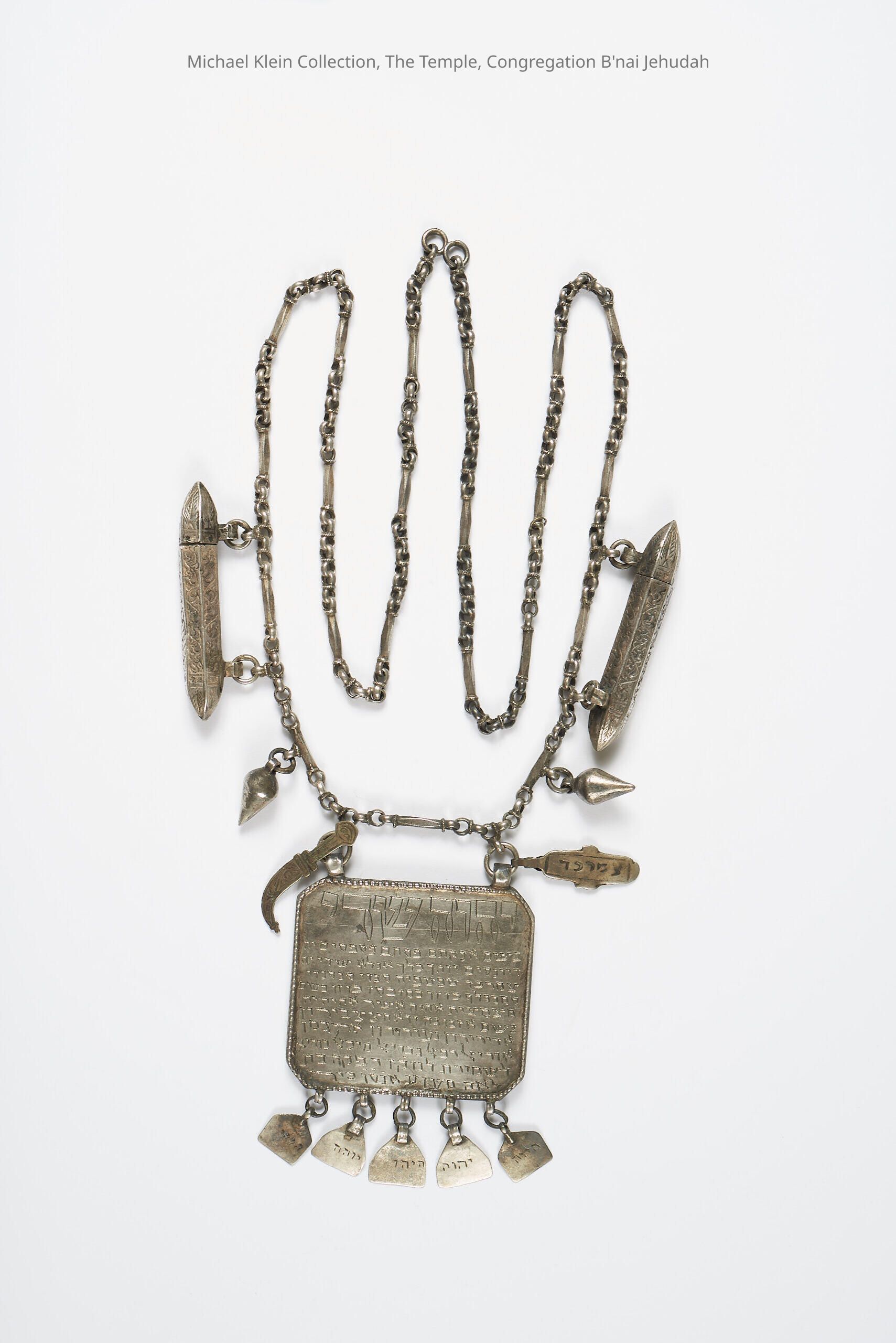 Each of the two cases on this amulet necklace can hold a small scroll with an additional protective blessing. The sword hanging over the main piece is a device to ward off Lilith. This piece is engraved with the name Rikva Bat Leah.Made/Created