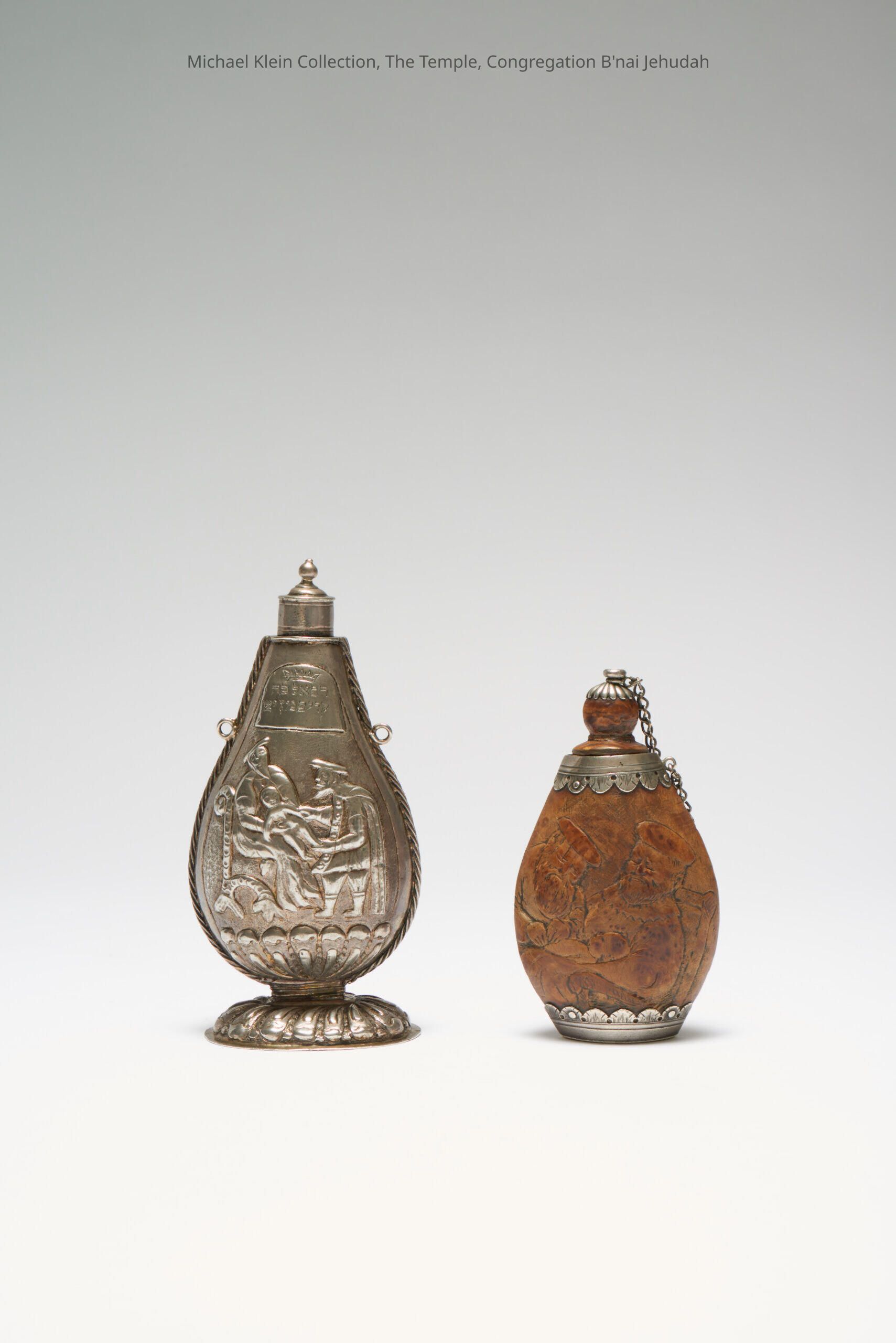 Flattened pear form, carved on one side with scene of the Mohel, Sandak, and baby; other side carved