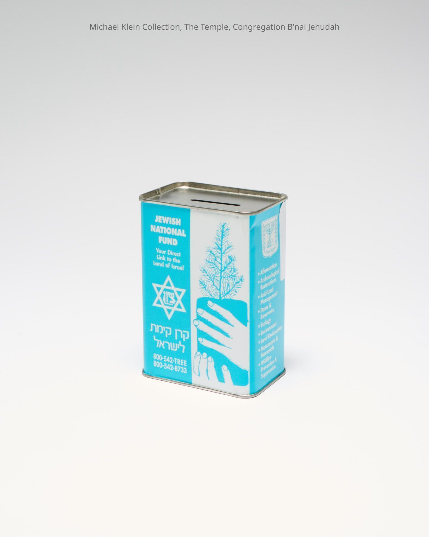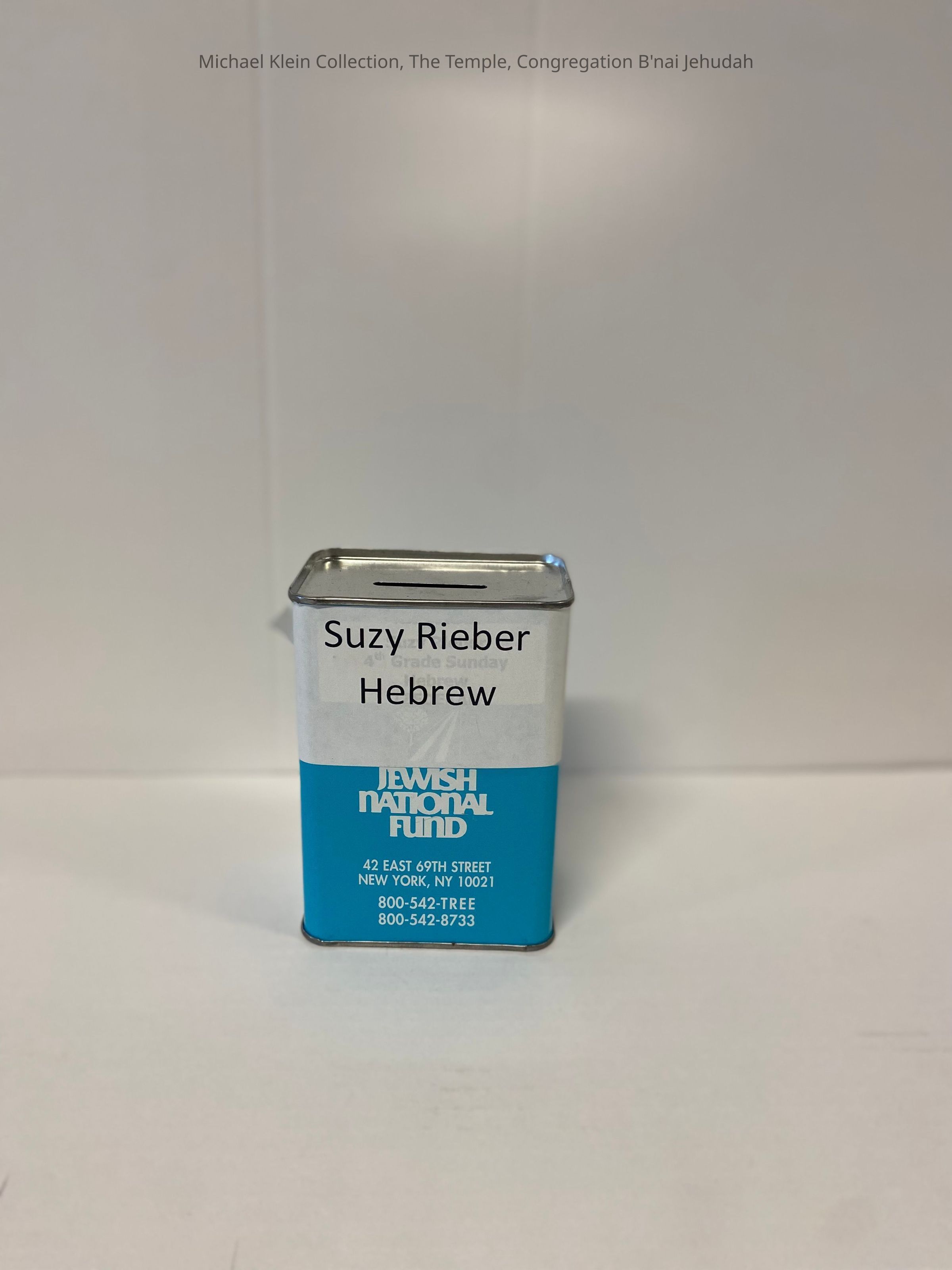 Donation for Jewish National Fund. The sticker on the front says "Suzy Rieber Hebrew". The sticker underneath that says "Suzy Reiber 4th Grade Sunday Hebrew."Made/Created
